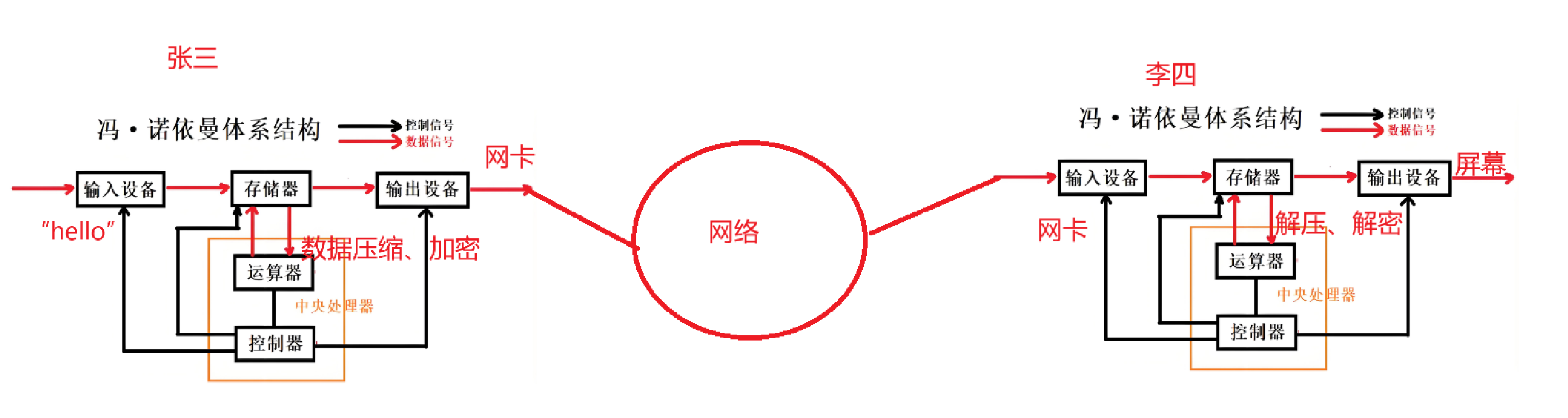 一天张三登上QQ给李四发消息“hello”,设备从输入设备获取数据后加载到内存中,再经内存至CPU进行数据压缩、加密等处理,后传至网卡上传网络;李四设备的网卡接收到数据后同样需要将数据经过内存传入CPU进行解压解密等操作,最后传送到屏幕上点亮相应像素点。