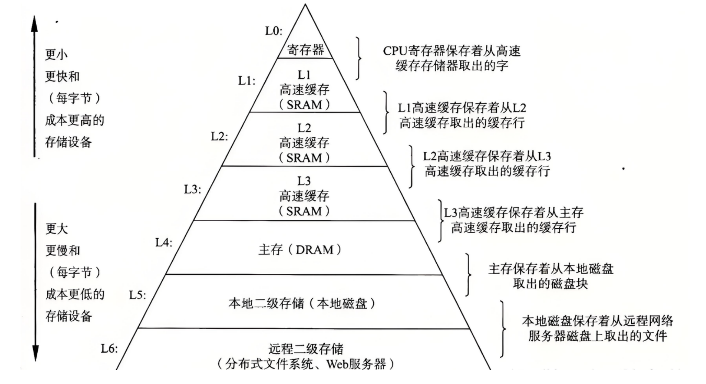 可以看到越靠近中央处理器(CPU)的存储速度越快,造价越高,体量也越小。根据木桶短板效应计算机的整体效率主要是被L6、L5这类速度明显不足的存储结构限制。