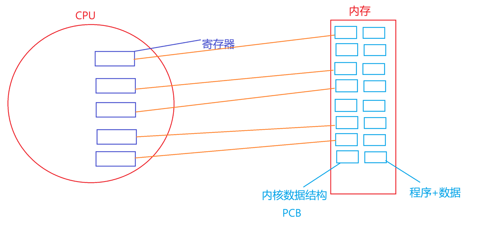 CPU中的寄存器除了存储进程产生的临时数据外,还充当着链接内存的桥梁:地址寄存器会记录内存中PCB的地址,数据寄存器将 PCB 中的关键信息(如目标进程的寄存器上下文、内存页表)读取到通用寄存器中,供内核程序(如调度器)分析或修改。