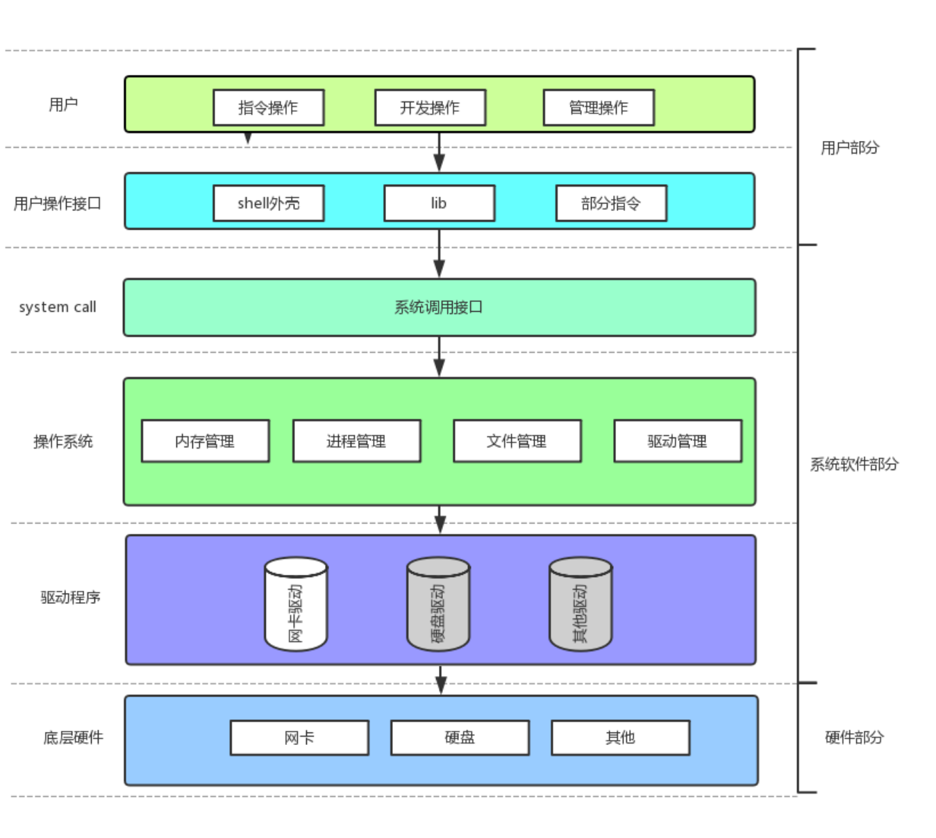 之前我们使用各种库函数(如printf)、指令属于用户操作接口层次,其会去调用操作系统提供的系统调用接口再依次往下最终驱使底层硬件进行相关操作。