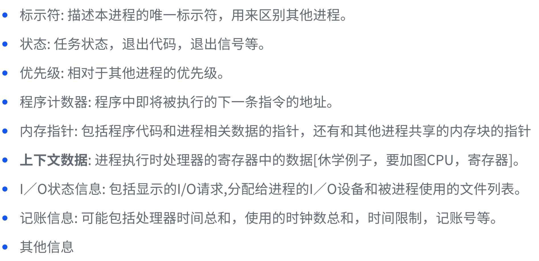 - 用数据记录状态:操作系统会为每个进程创建 “进程控制块(PCB)”,记录进程需要的资源(如内存大小、CPU 需求)、当前状态(就绪 / 运行 / 阻塞);同时用 “资源描述符” 记录硬件资源的使用情况(如内存是否空闲、设备是否被占用)。