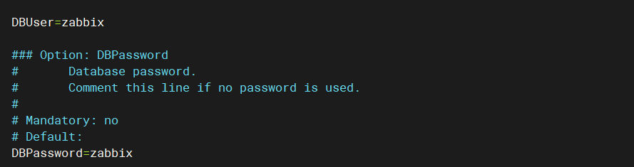 vim /etc/zabbix/zabbix_server.conf DBPassword=zabbix 作用: 建立数据库连接:配置 Zabbix Server 与 MySQL 数据库的连接参数 安全认证:设置数据库访问密码,确保只有授权的程序能够访问数据库 服务启动前提:没有正确的数据库配置,Zabbix Server 无法启动 数据存储路径:告诉 Zabbix Server 监控数据应该存储在哪个数据库中
