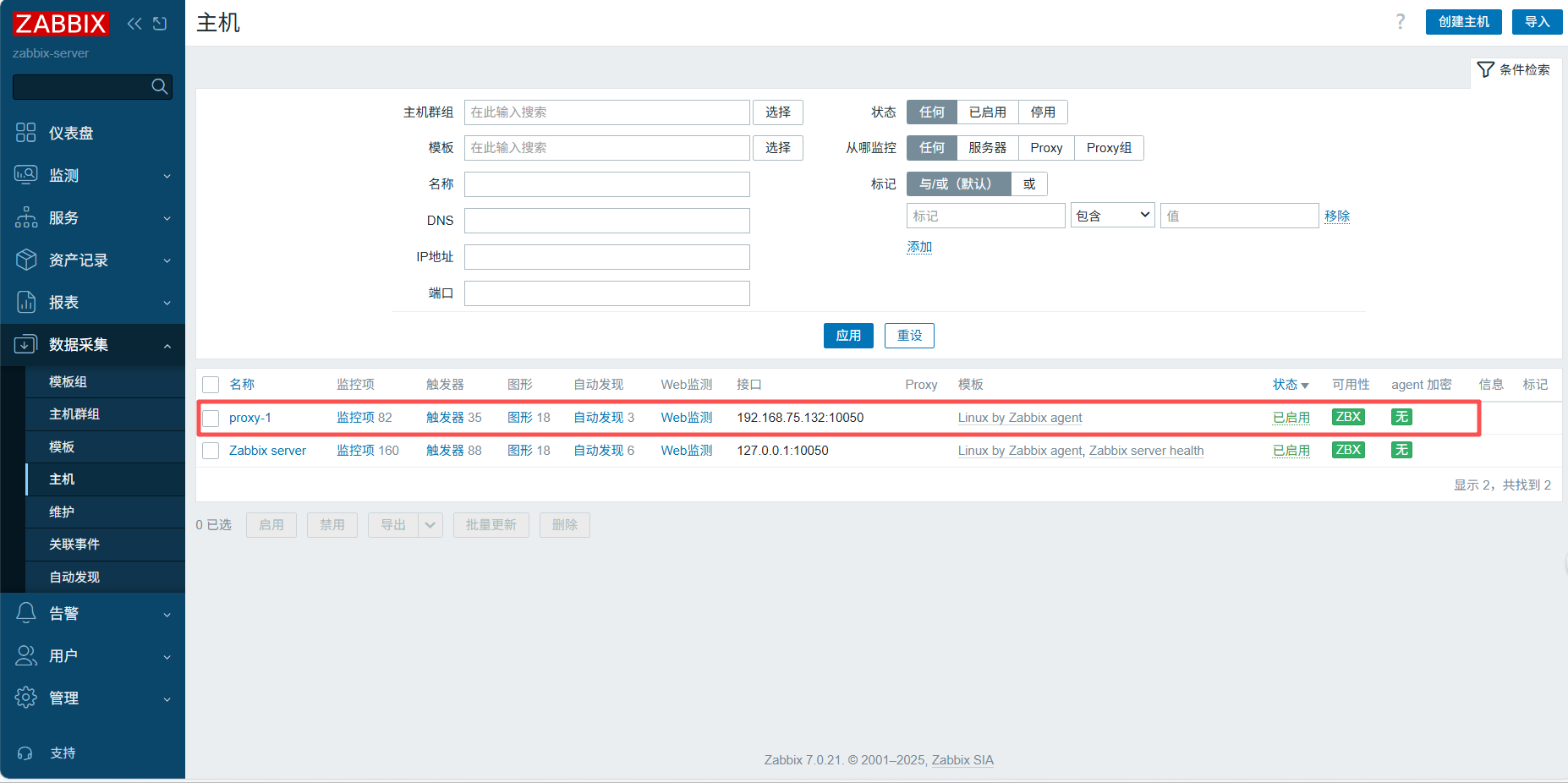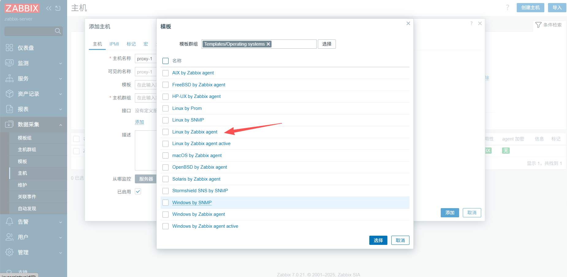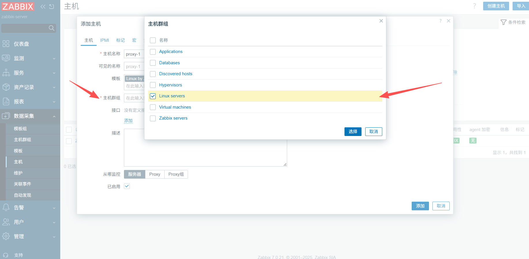 将页面刷新后会出现监控的proxy-1,无刷新无法成功,需要关闭防火墙,将selinux设置成宽容模式,然后重启zabbix-agent.service