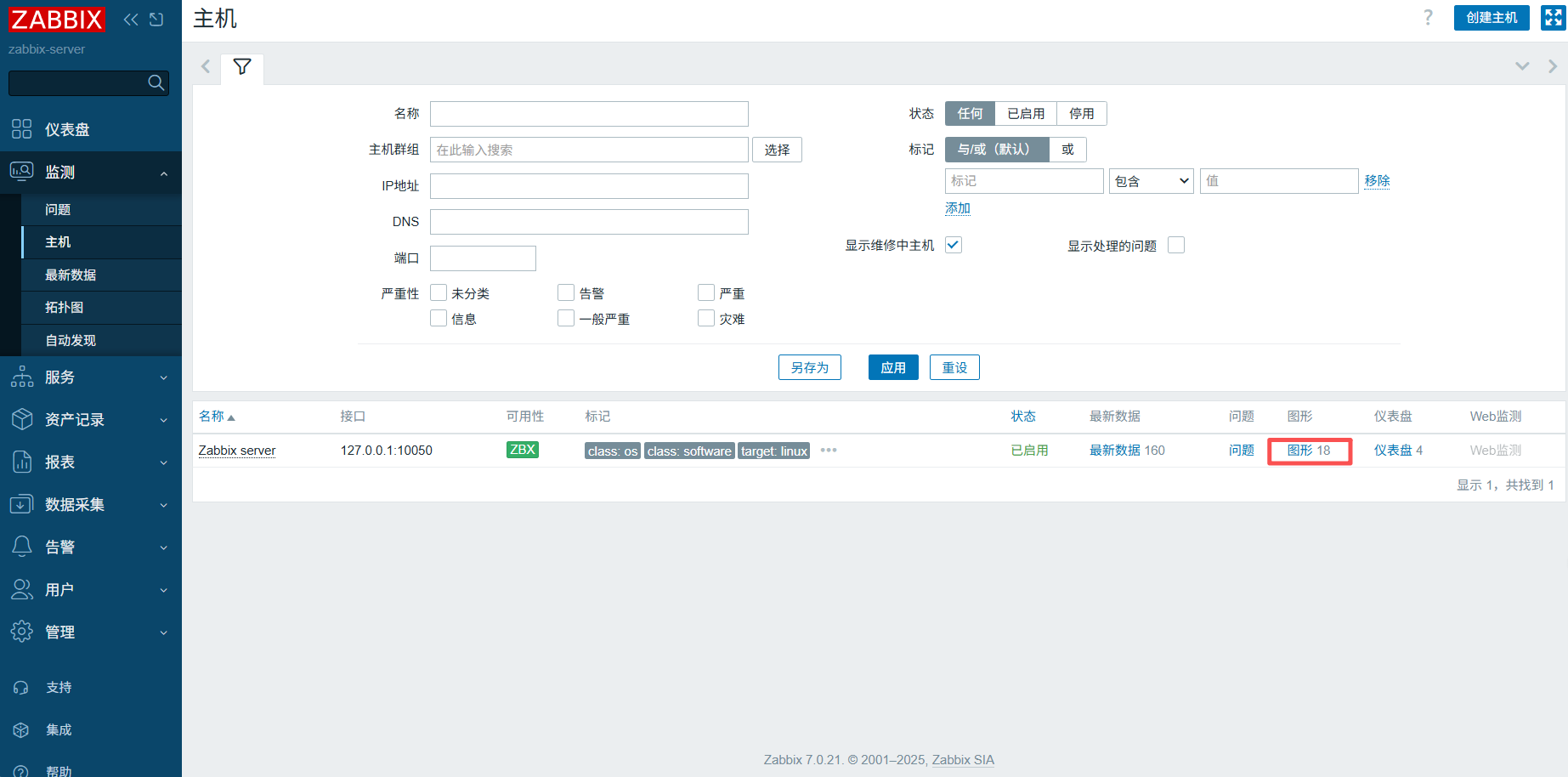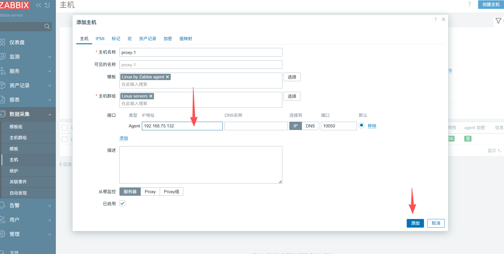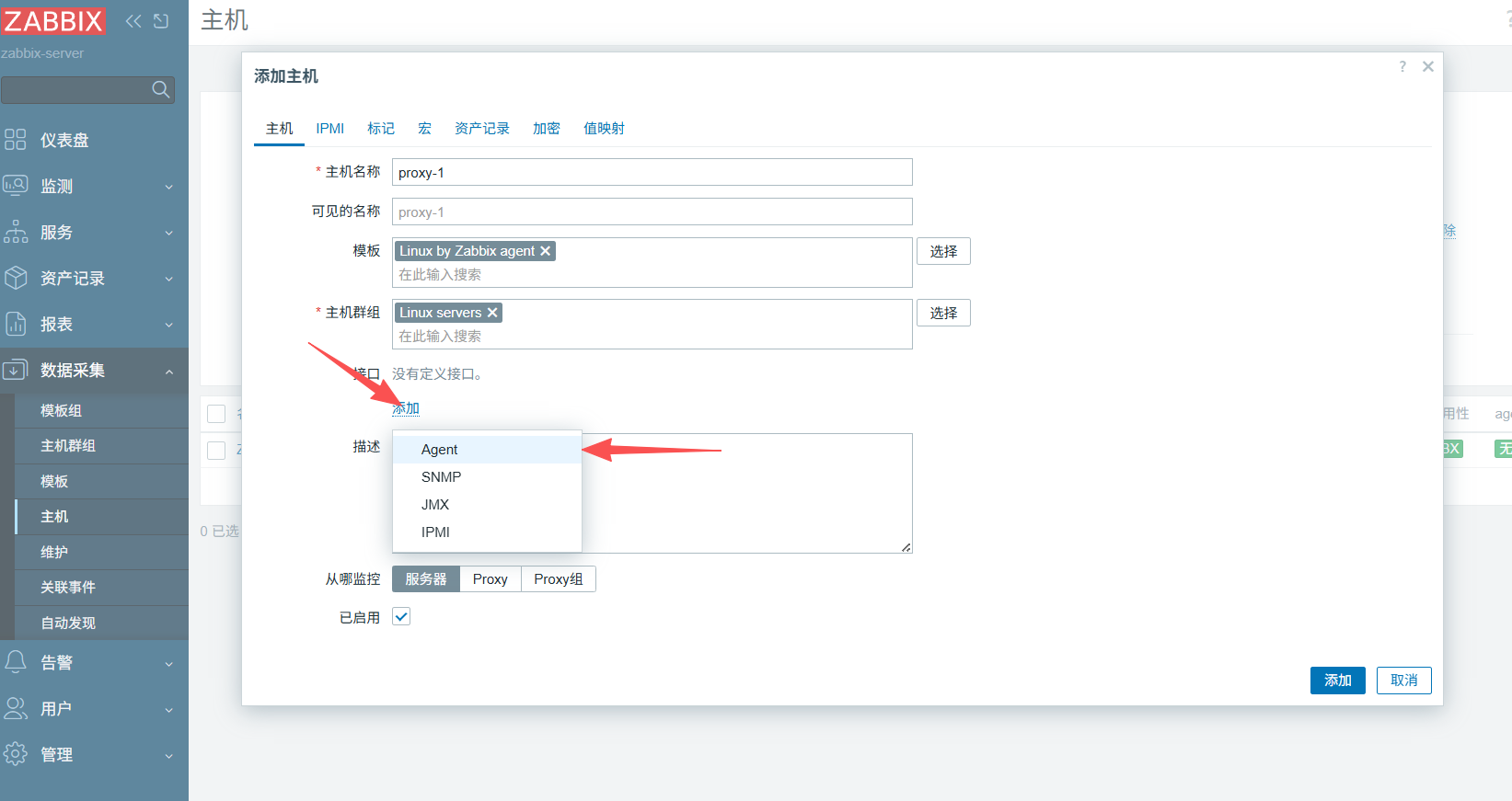 将页面刷新后会出现监控的proxy-1,无刷新无法成功,需要关闭防火墙,将selinux设置成宽容模式,然后重启zabbix-agent.service