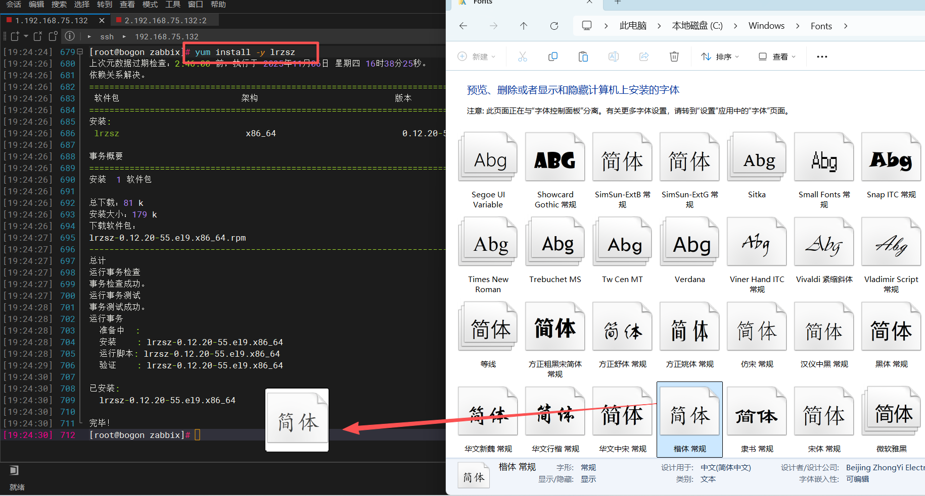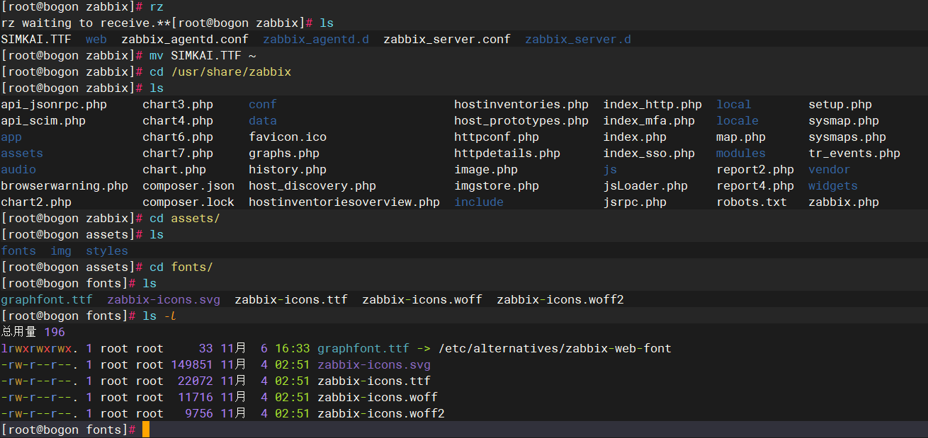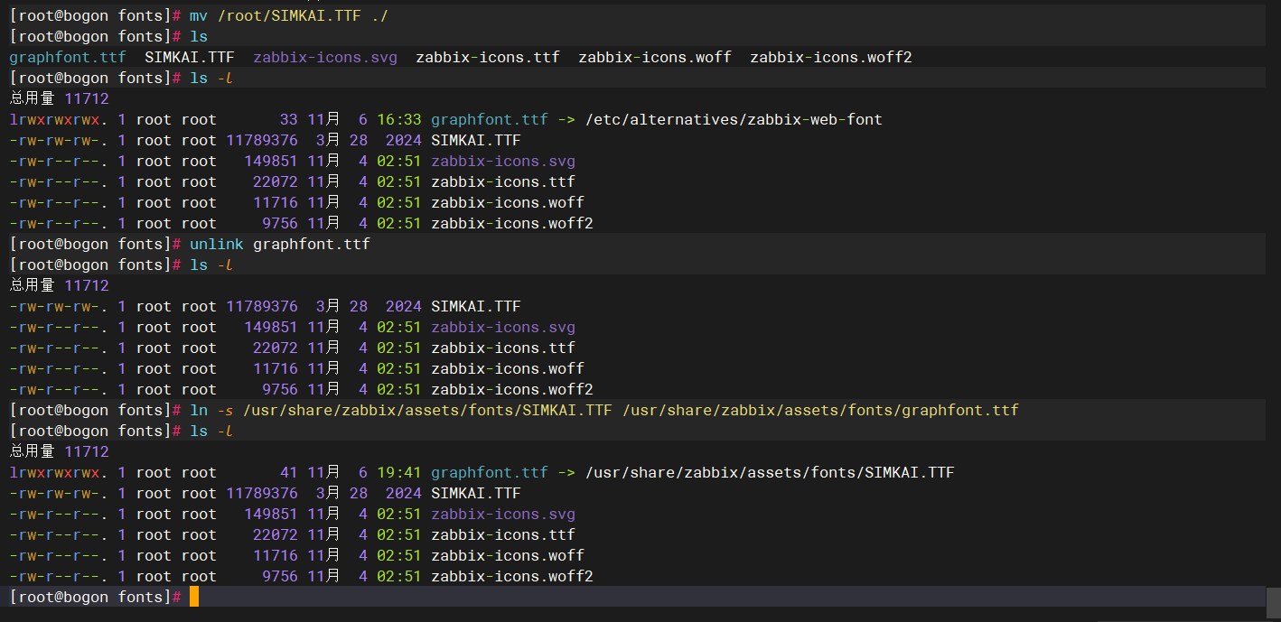 从windows系统中:C:\Windows\Fonts路径下拷贝“SIMKAI.TTF”字体到zabbix server中,放到/usr/share/zabbix/assets/fonts