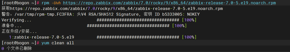 目的: 添加官方软件仓库:通过安装 Zabbix 官方的 rpm 包,为系统添加 Zabbix 软件的下载源 确保软件版本:保证能够安装到最新、最稳定的 Zabbix 7.0 版本 解决依赖关系:官方源会自动处理软件包之间的依赖关系 yum clean all:清理本地 yum 缓存,确保从新添加的源获取最新信息