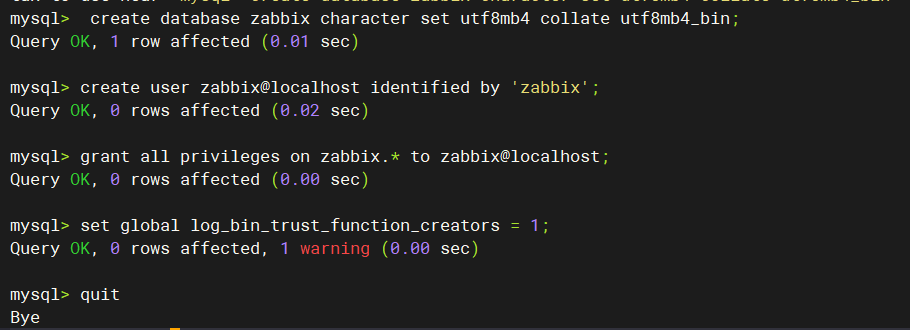 1. **创建专用数据库**:`create database zabbix...` 创建名为 zabbix 的数据库,使用 utf8mb4 字符集支持中文 2. **创建数据库用户**:`create user zabbix@localhost...` 创建专用的数据库用户 3. **权限配置**:`grant all privileges...` 给予 zabbix 用户对数据库的完全访问权限 4. **存储过程设置**:`set global log_bin_trust_function_creators = 1` 允许创建存储过程