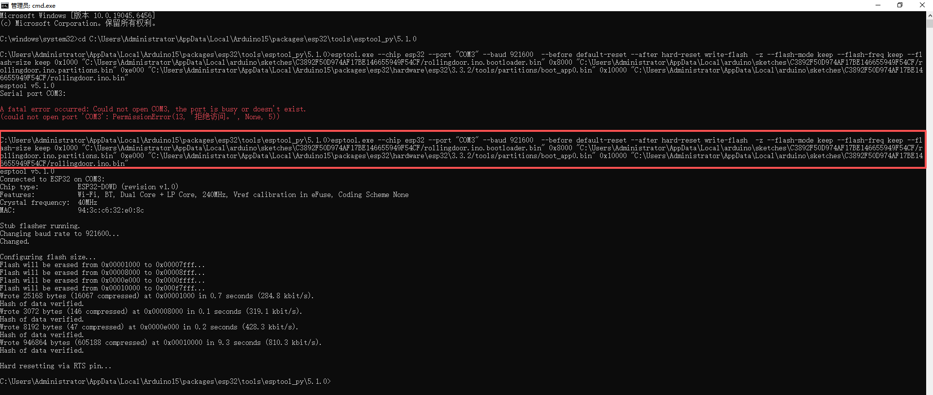 第二部:找到详细日志中的烧录指令,然后直接复制到CMD执行,失败了之后,直接重新执行指令即可。