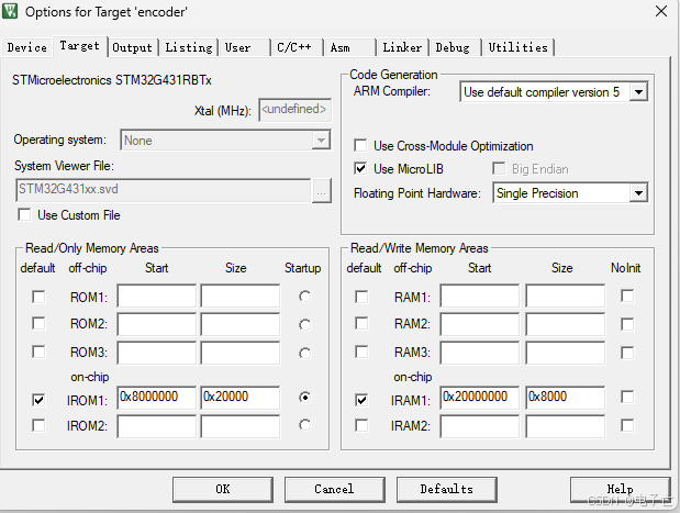 配置完成后生成工程。首先重定向串口,方便使用printf打印信息,在魔术棒中勾选Use MicrolLIB。