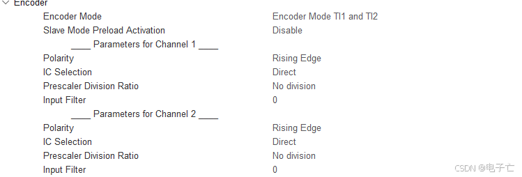 编码器模式选择检测tim_ti1与tim_ti2两种边沿。