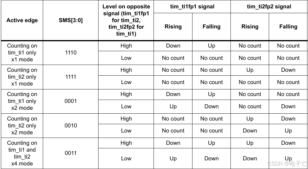 我们重点关注编码器接口是如何实现信号采集和倍频的。《STM32F4xx参考手册》给出了的编码器信号与计数器方向和计数位置之间的关系,如下表所示。