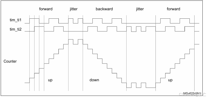 最后如下图所示,下图所展示的信息对应表格中“在TI1和TI2处均计数”。这种采样方式可以把两个通道的上升沿和下降沿都用来计数,计数方向也是两个通道同时参考, 相当于原来仅在一个通道处计数的2倍,所以这种就能实现对原始信号的4倍频。