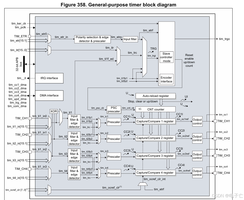 可以看到,在此模式下,编码器顺时针旋转一转,计数器加4,那么逆时针旋转一转,计数器减4。在数据手册中,也列出了此模式下计数器的框图: