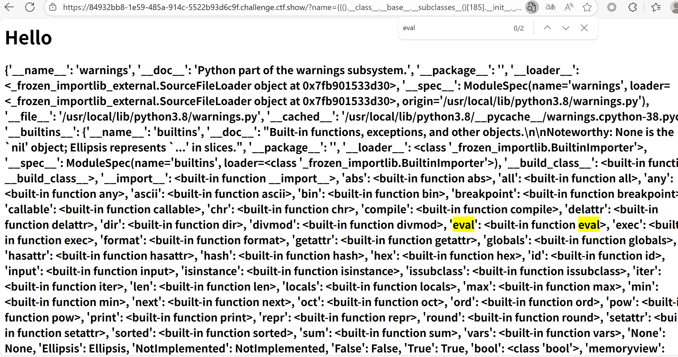 但由于 eval 在全局域中是一个 built-in function 即 内置函数 ,所以我们无法直接通过 __globals__['eval'] 来直接调用内置函数,Python 的内置函数和对象通常是全局可用的,但它们通常不是函数内部的一部分。因此,要在函数内部访问内置函数(如 eval)或内置对象(如 os),需要通过 __builtins__ 来访问。SSTI 注入 - Hello CTF
