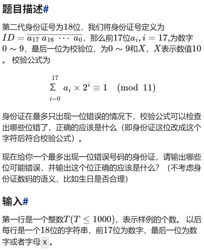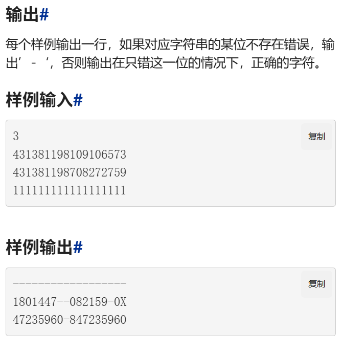 if(ans == id[i] || (ans == 10 && i<17)) printf("-");(ans == 10 && i<17)这个条件是我按照样例2写出来的,但是我不明白它的逻辑,i<17不是设置了最大值是9吗