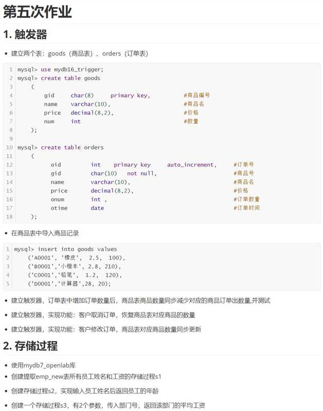 1 row in set (0.00 sec)5、建立触发器,实现功能:客户修改订单,商品表对应商品数量同步更新