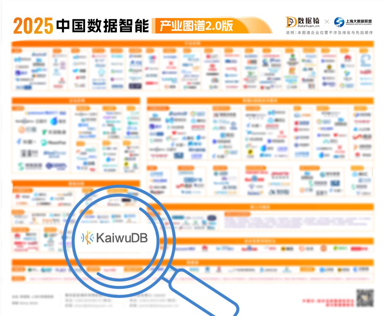 10 月,大数据行业权威媒体数据猿与上海大数据联盟联合发布了《2025 中国数据智能产业图谱 2.0 版》,全景描绘了中国数据智能产业最新市场格局、技术趋势、企业动态。KaiwuDB 凭借在“DB+AI”与“Data+AI”领域的技术积累与场景落地能力,连续第二年入选该图谱的【基础设施-数据库】版块。