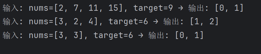 if __name__ == "__main__":# 示例输入test_cases = [([2, 7, 11, 15], 9),([3, 2, 4], 6),([3, 3], 6)]# 执行测试solution = Solution()for nums, target in test_cases:result = solution.twoSum(nums, target)print(f"输入: nums={nums}, target={target} → 输出: {result}")