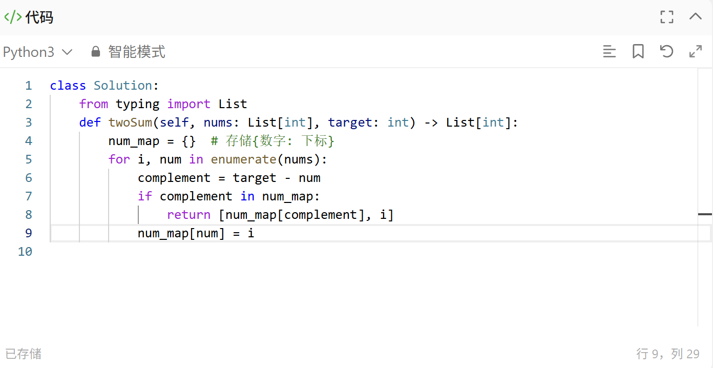 from typing import Listclass Solution:def twoSum(self, nums: List[int], target: int) -> List[int]:num_map = {} # 存储{数字: 下标}for i, num in enumerate(nums):complement = target - numif complement in num_map:return [num_map[complement], i]num_map[num] = ireturn []# 测试代码