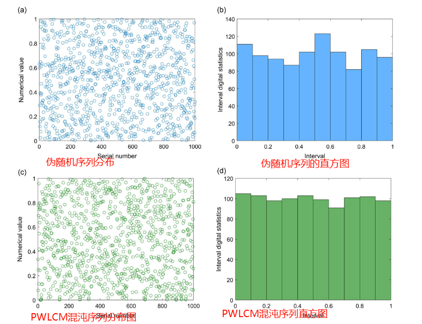 采用伪随机数和PWLCM序列两种方法生成( 0、1 )区间内的1000个随机数;然后,将区间划分为10个相等的子区间,并统计每个子区间内的随机数个数。图4给出了两种方法产生的随机数的位置和数量分布。从图4中可以看出,PWLCM序列的随机数在各个子区间内分布较为均匀。