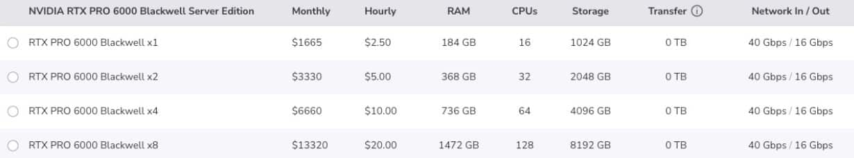 MLOps工程师可以按小时租用单个GPU,也可以构建包含多达8个NVIDIA RTX PRO™ 6000 Blackwell服务器版GPU、NVIDIA BlueField-3® DPU、128个vCPU、1,472 GB DRAM和8,192 GB NVMe的高性能推理集群。(图1)
