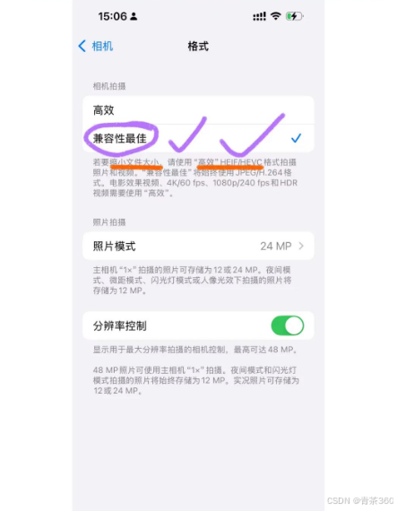 你会看到两个选项:高效和兼容性最佳。如果你想用JPEG格式,记得选择“兼容性最佳”。这样拍出来的照片就会是JPEG格式啦!
