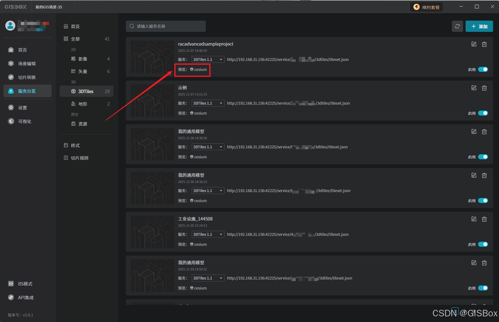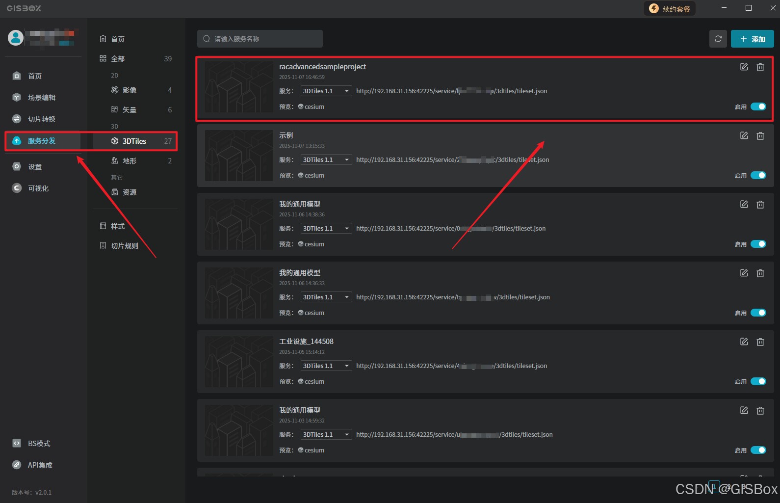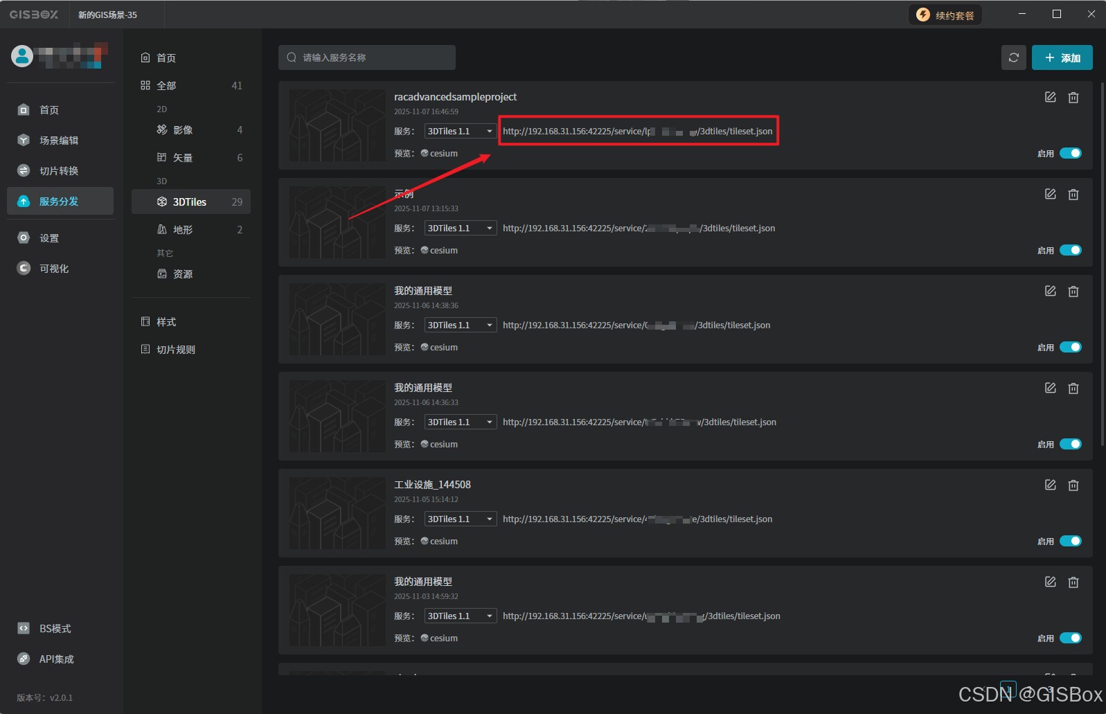 5、设置完成后,勾选“同时发布成服务”,“服务分发”的“3DTiles服务”中会自动添加相对应的服务。