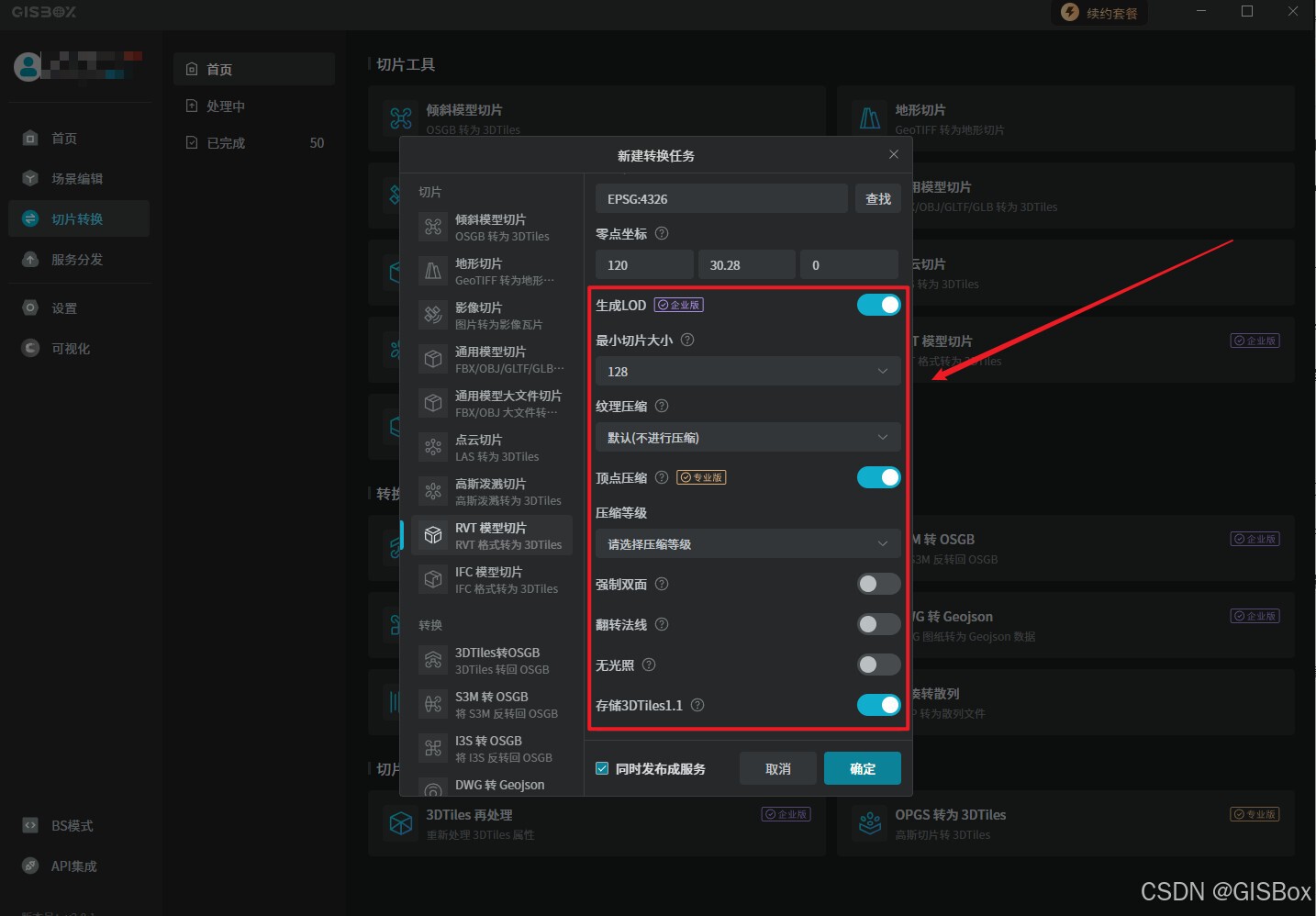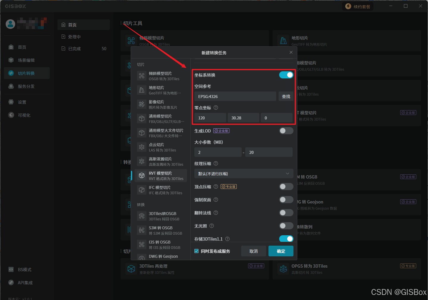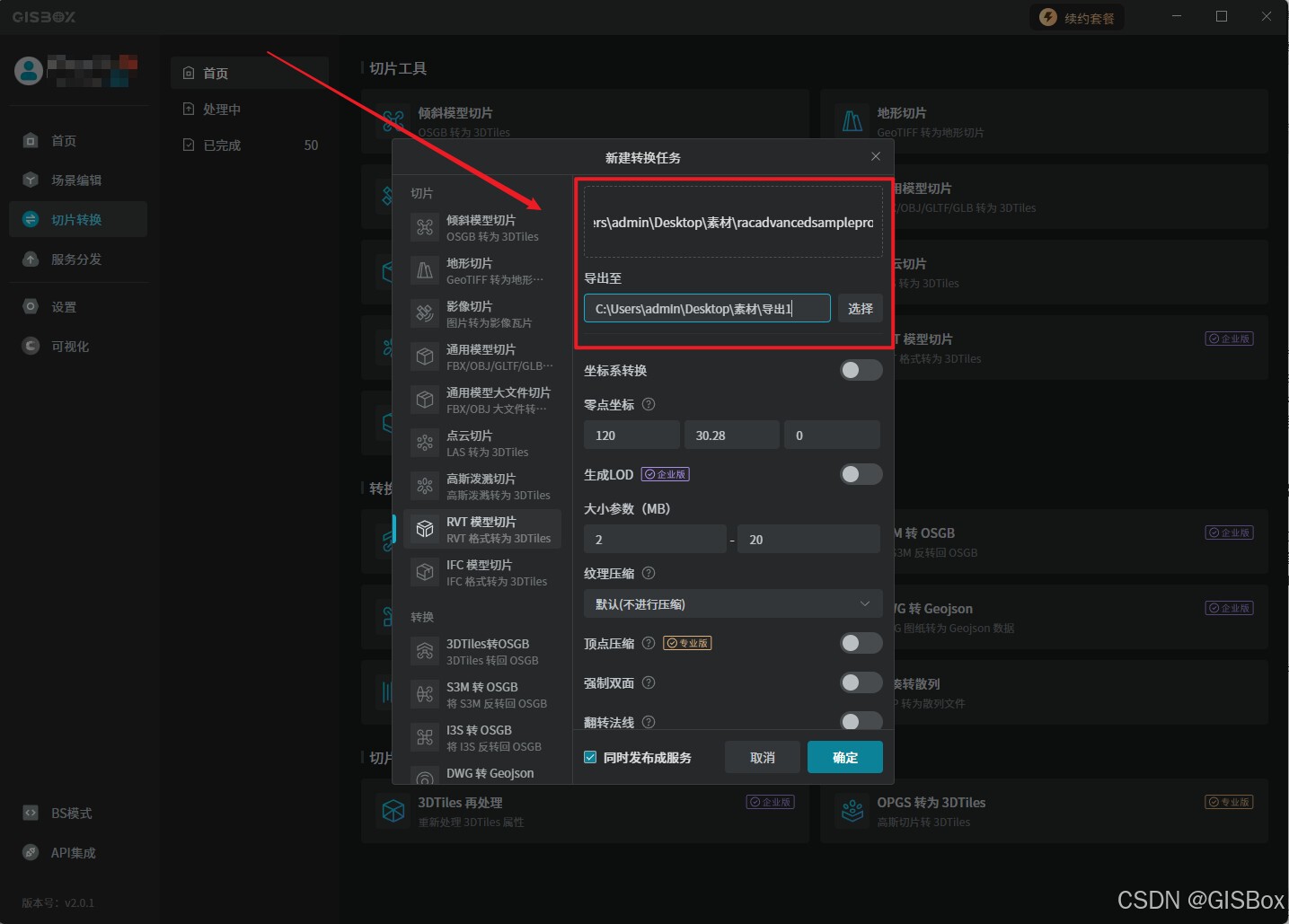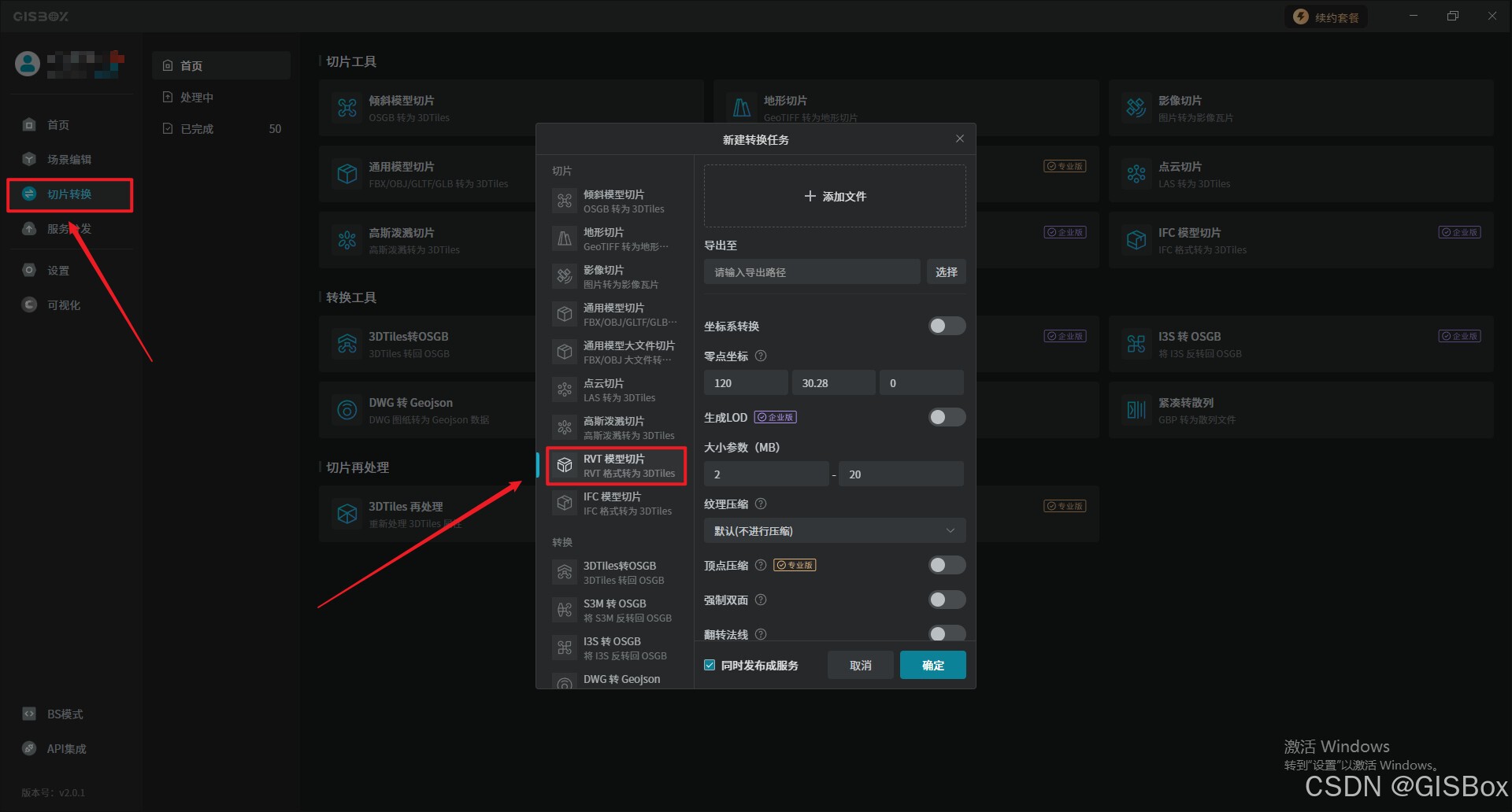 1、首先打开“GISBox”软件,在“切片转换”中选择“RVT模型切片”,进行新建转换任务。