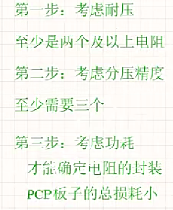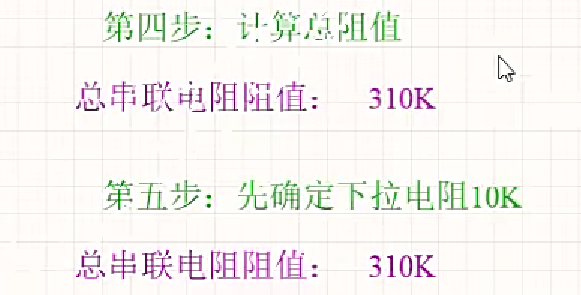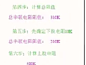 根据电路中连接,确定节点电压输出多少,然后选取电流一般1ma,计算总阻抗,再根据节点电压确定一个电阻,在进行其他电阻的确定。在计算电阻上的功耗,进行选取封装。