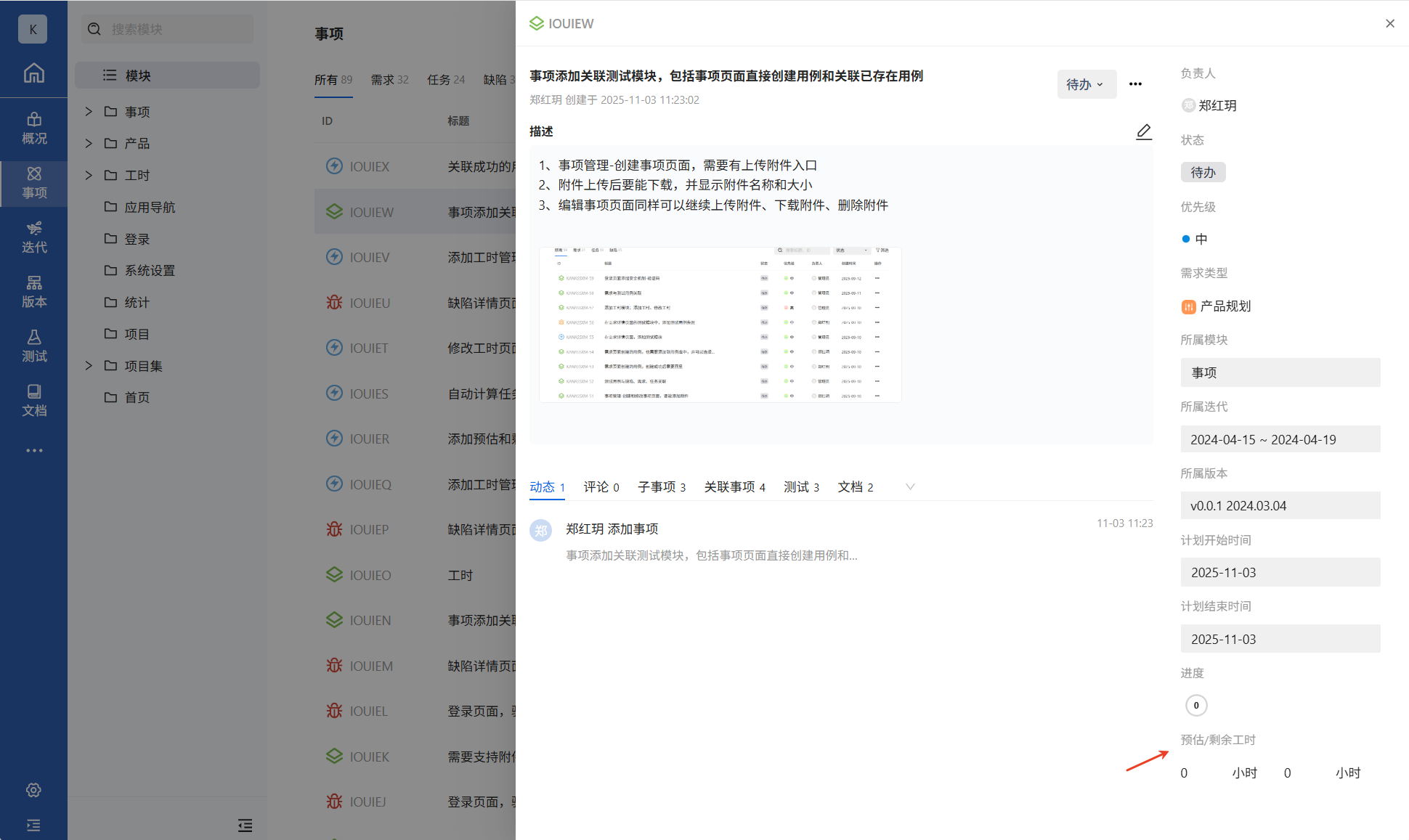 工时的作用:用来记录事项所花费的时间,并通过预估和剩余时间,来自动计算试事项的进度。