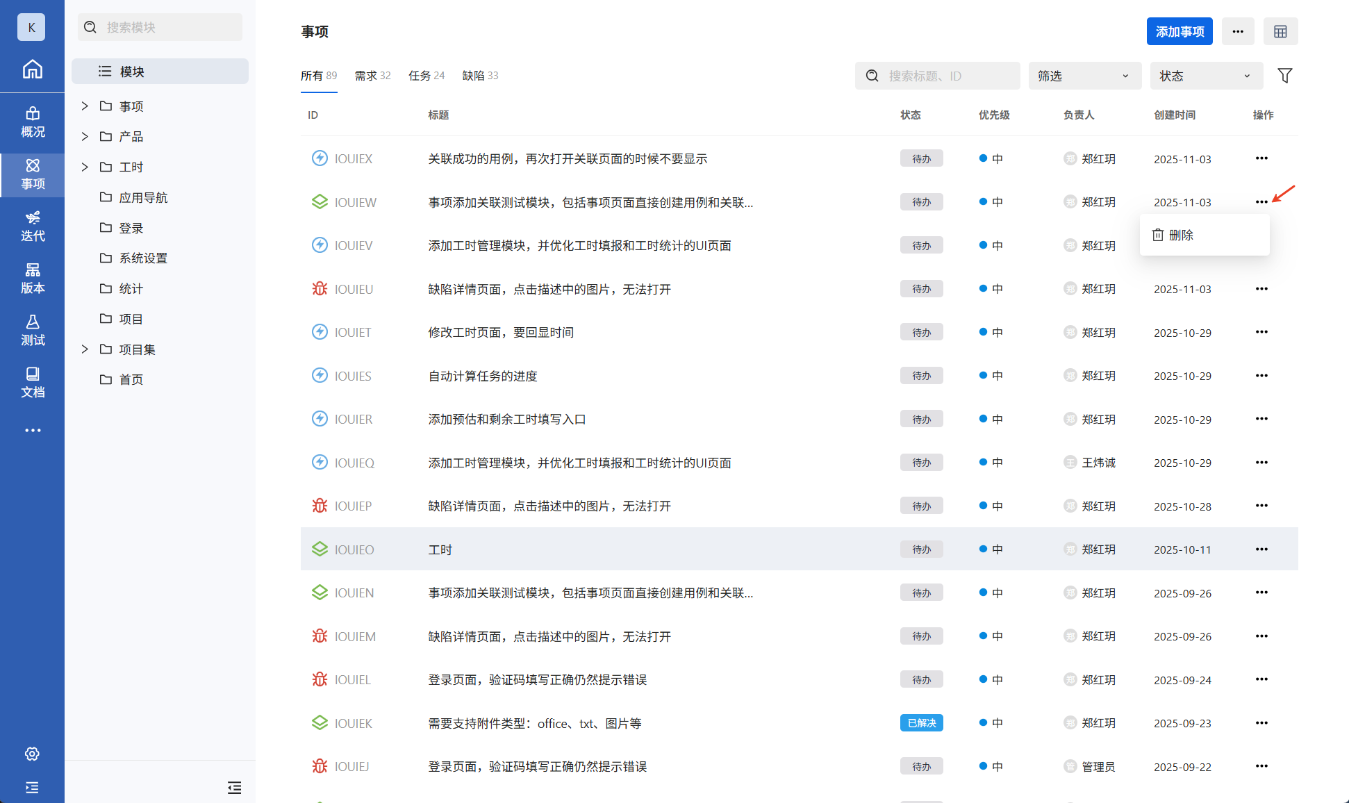 进入事项详情->工时,鼠标悬浮在任意工时上,即可出现删除按钮,点击后会删除工时