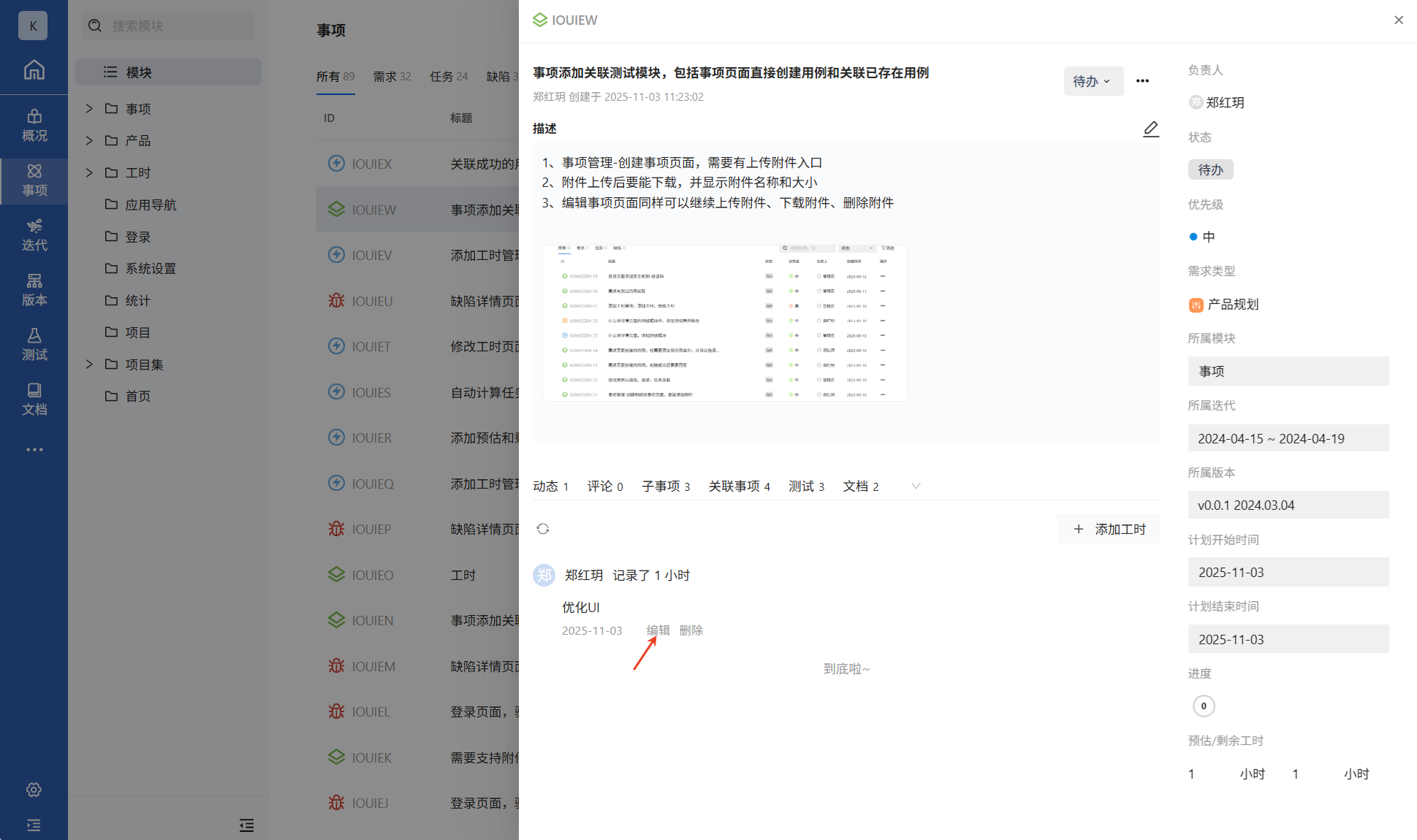 进入事项详情->工时->编辑,支持修改登记用时、剩余用户和工作内容