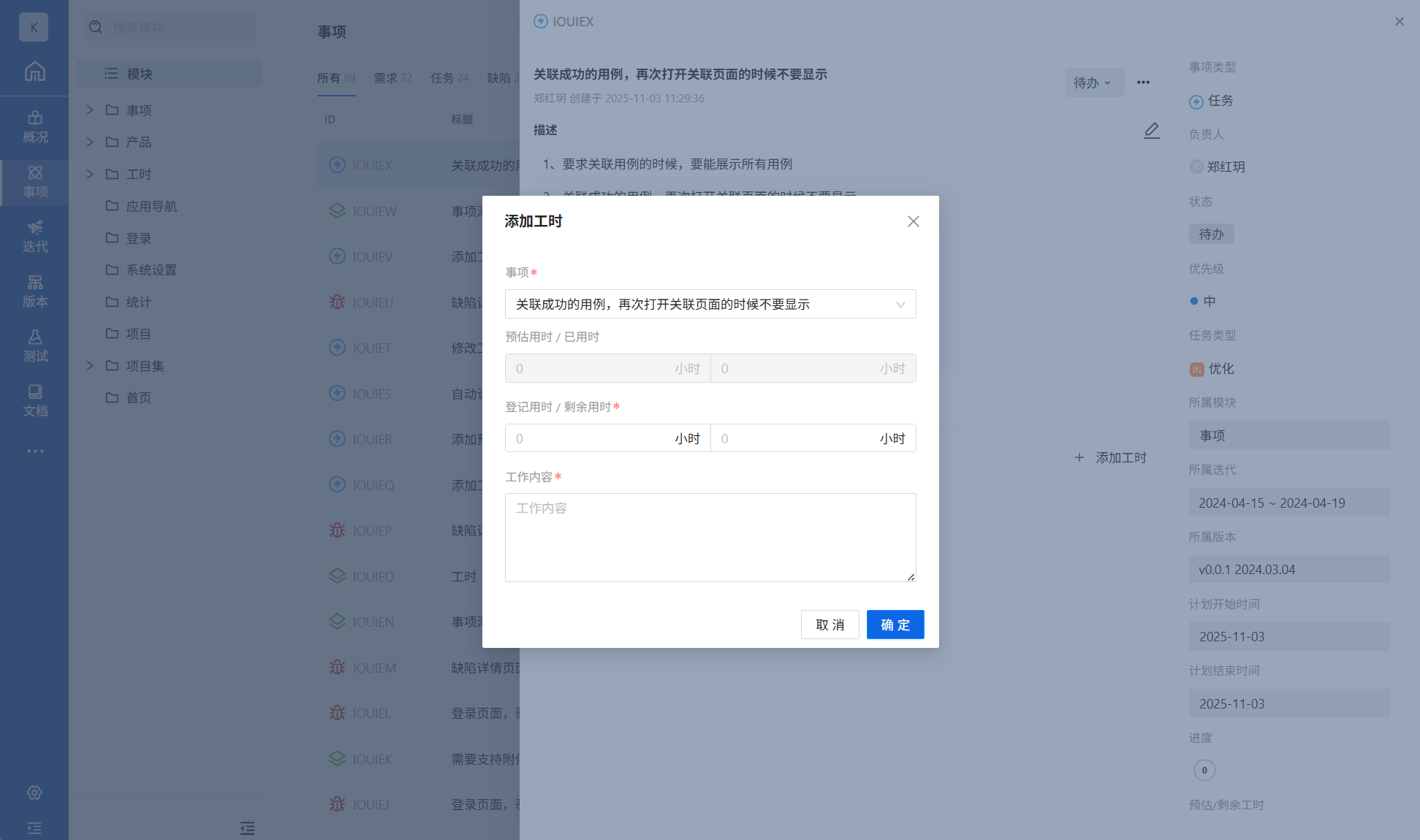 进入项目->事项->事项详情->工时,点击添加工时可以为当前事项添加工时