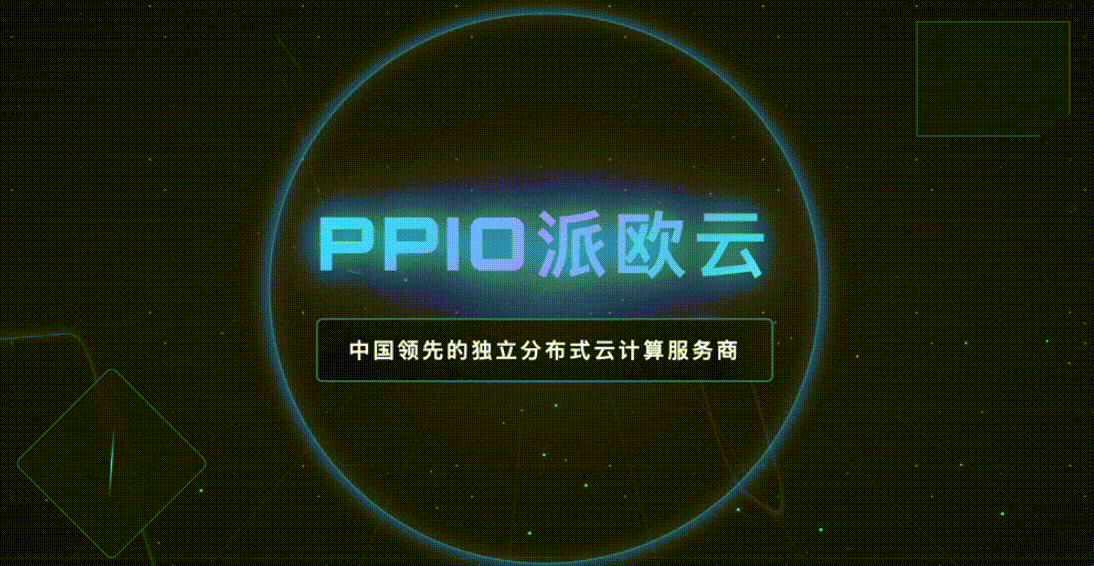 标题位于画面中心前景,采用未来感字体(粗体、发光描边,文字占位符:“PPIO派欧云”)。
