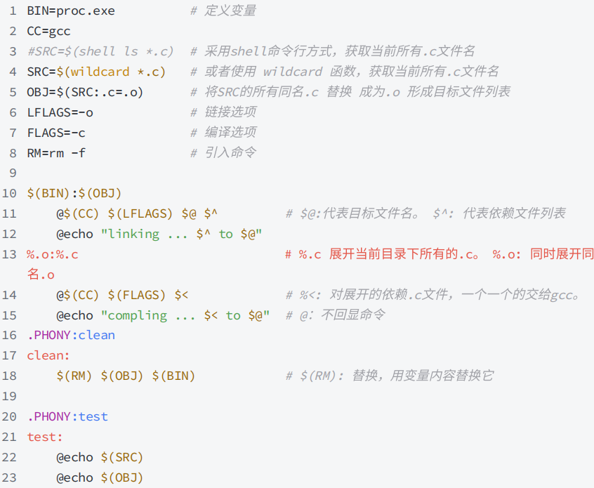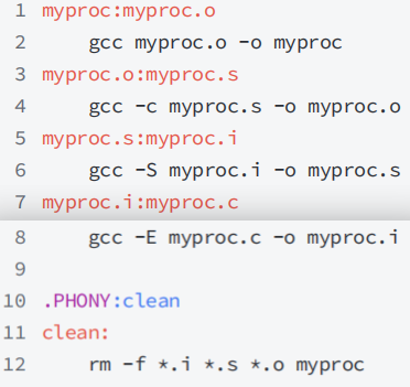 myproc.o ⽂件的依赖性,如果找到则再根据那⼀个规则⽣成 myproc.o ⽂件。(这有点像⼀