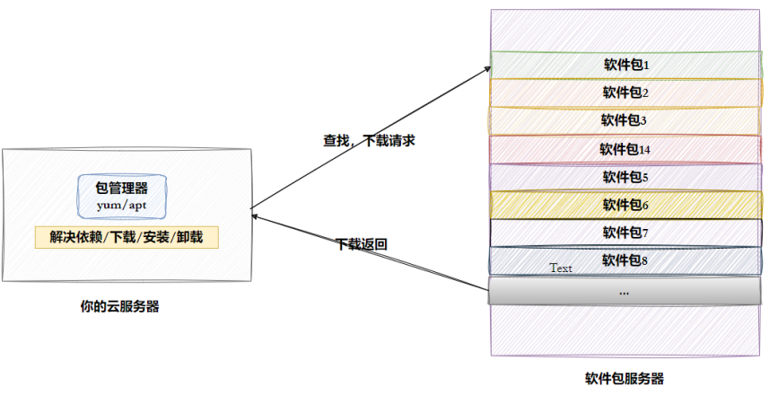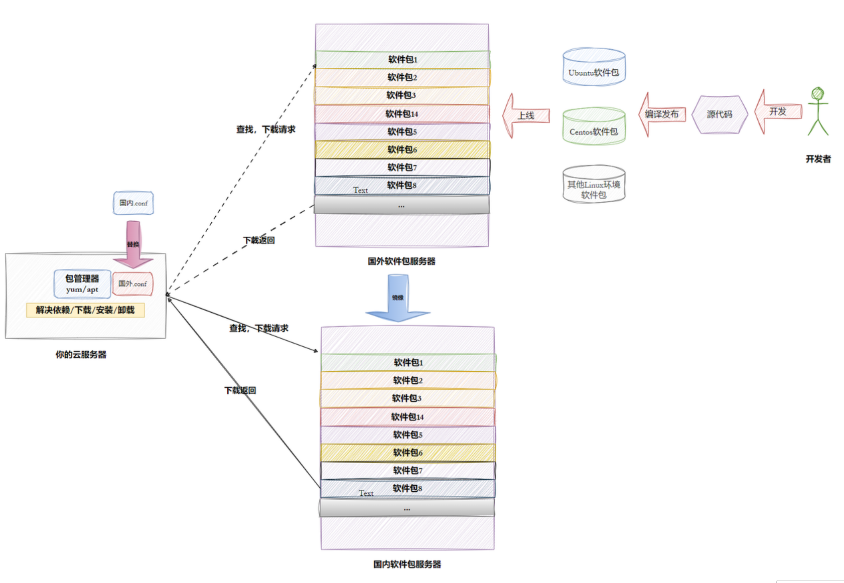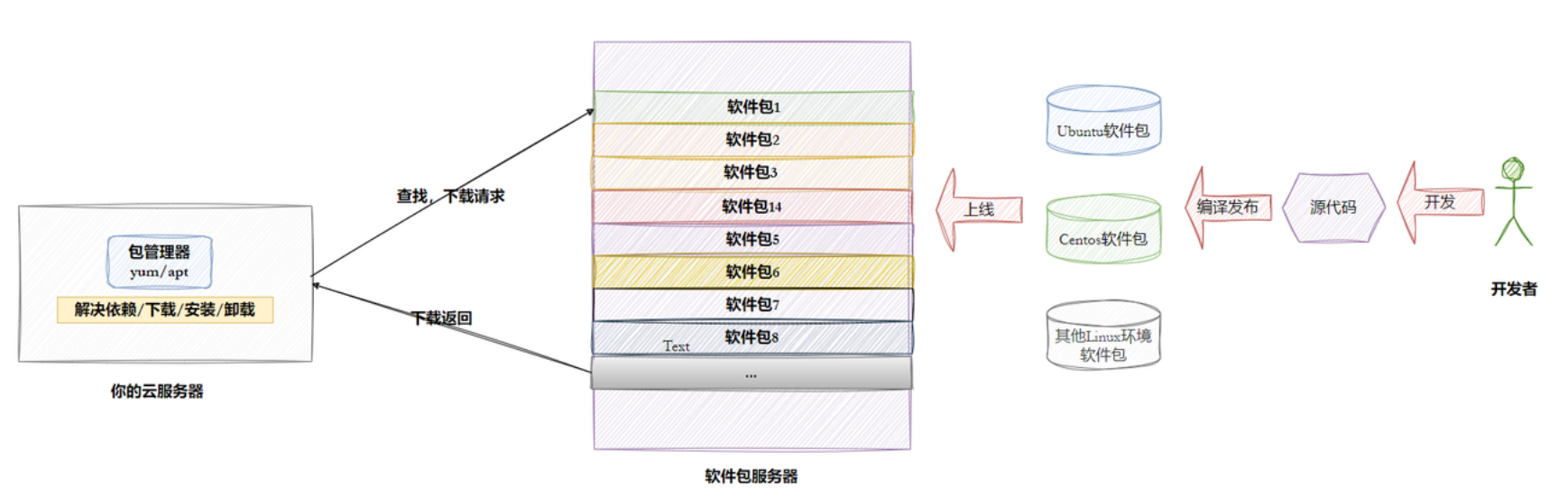 但是这样太⿇烦了, 于是有些⼈把⼀些常⽤的软件提前编译好, 做成软件包(可以理解成windows上的安装程序)放在⼀个服务器上, 通过包管理器可以很⽅便的获取到这个编译好的软件包, 直接进⾏安装.