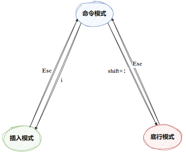 我们讲解vim的三种模式(其实有好多模式,⽬前掌握这3种即可),分别是命令模式(command mode)、插⼊模式(Insert mode)和底⾏模式(last line mode),各模式的功能区分如下: