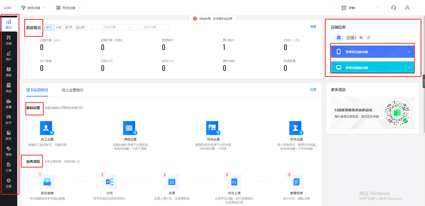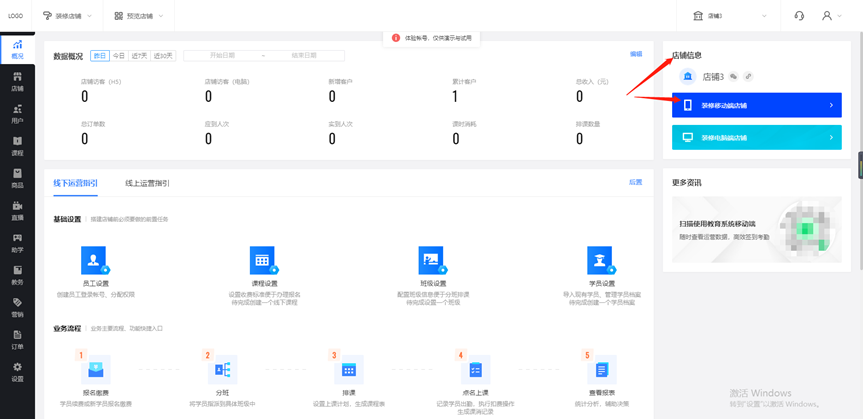 接着,在后台管理页面右侧找到【店铺信息】模块,点击【装修移动端店铺】,就能进入教育培训机构小程序的设计搭建页面(若制作电脑端网站店铺,点击【装修电脑端店铺】)。