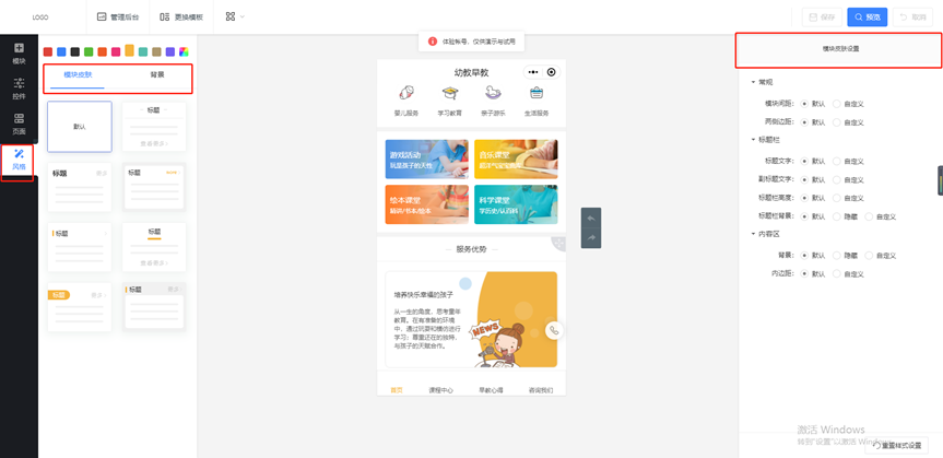- 调整风格:在【风格】选项里,能调整小程序模板的页面排版风格、背景图片或颜色,让模板更符合自身需求。