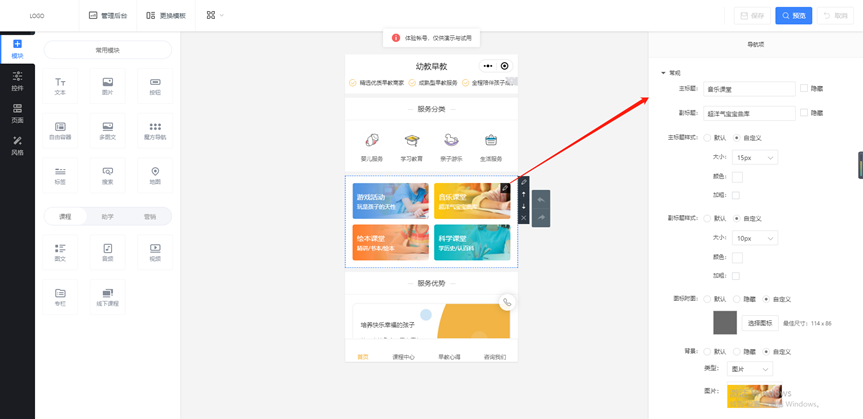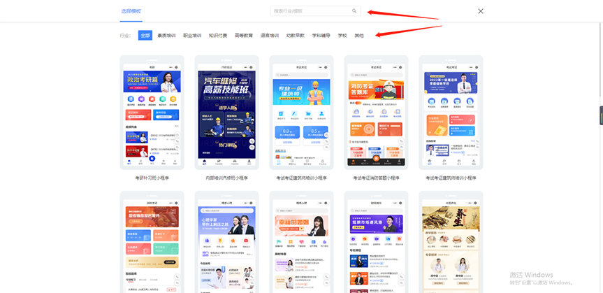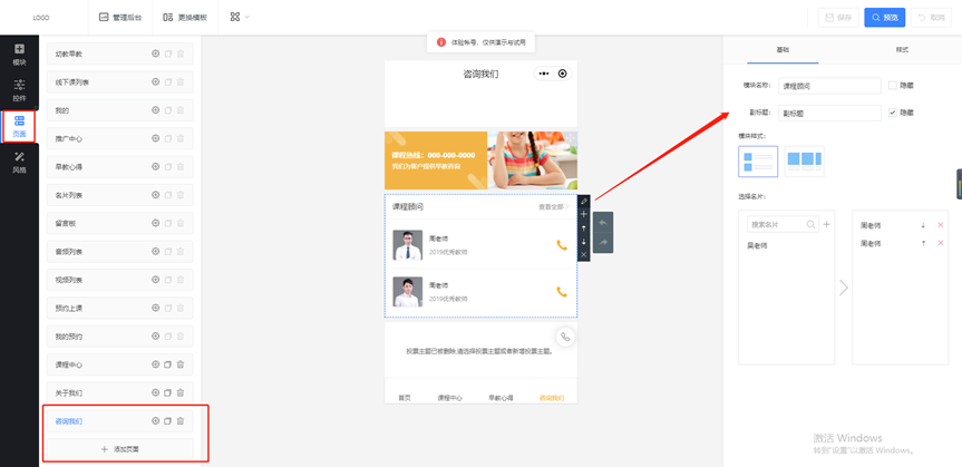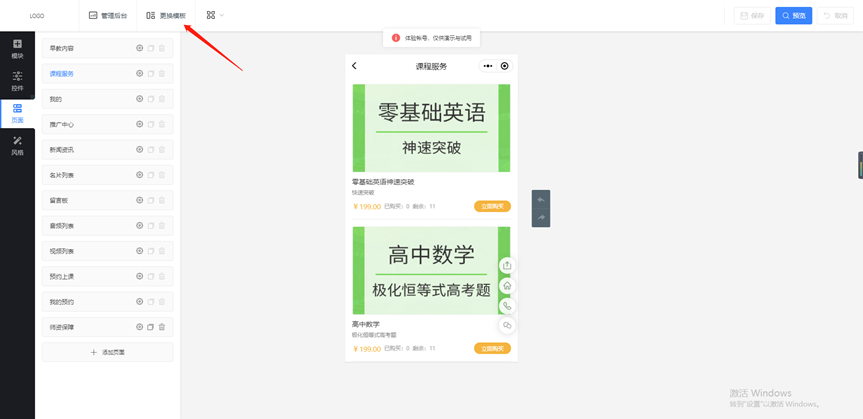 进入设计搭建页面后,点击左上角【更换模板】,从多种培训行业小程序模板中挑选心仪的模板,便可开始编辑制作。