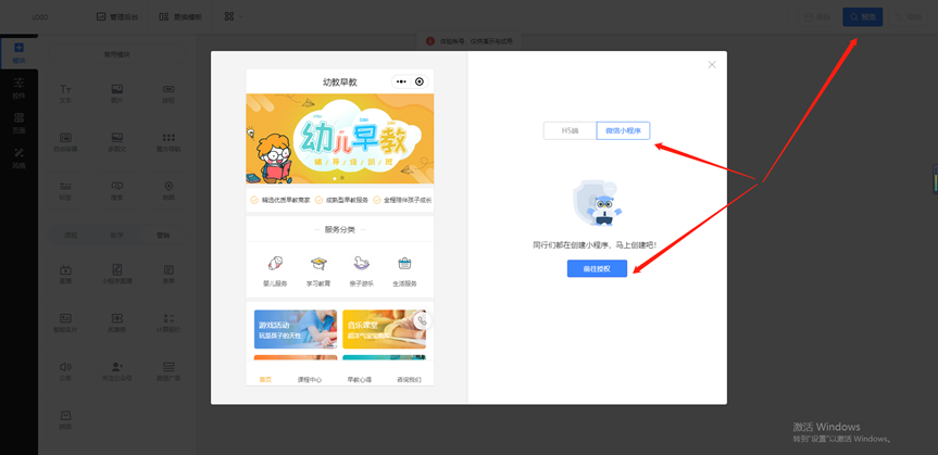 - 最后,小程序制作搭建好并预览确认无误后,就可以上线 H5 端网页店铺和教育培训机构微信小程序。
