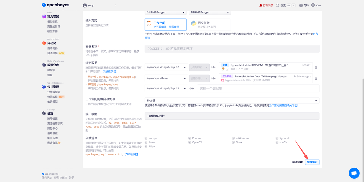 在当前页面中看到的算力资源均可以在平台一键选择使用。平台会默认选配好原教程所使用的算力资源、镜像版本,不需要再进行手动选择。点击「继续执行」,等待分配资源。