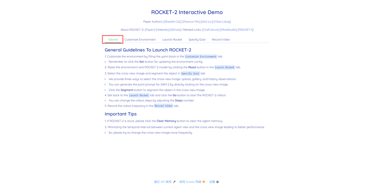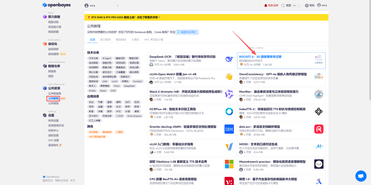 登录 OpenBayes.com,在「公共教程」页面,选择一键部署 「ROCKET-2:3D 游戏零样本迁移」教程。